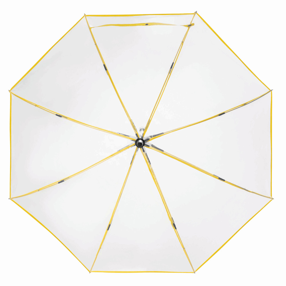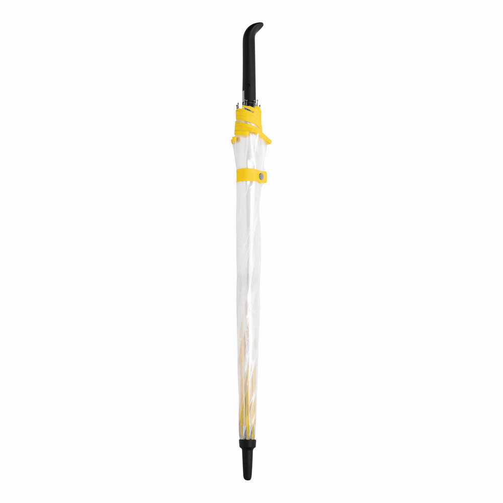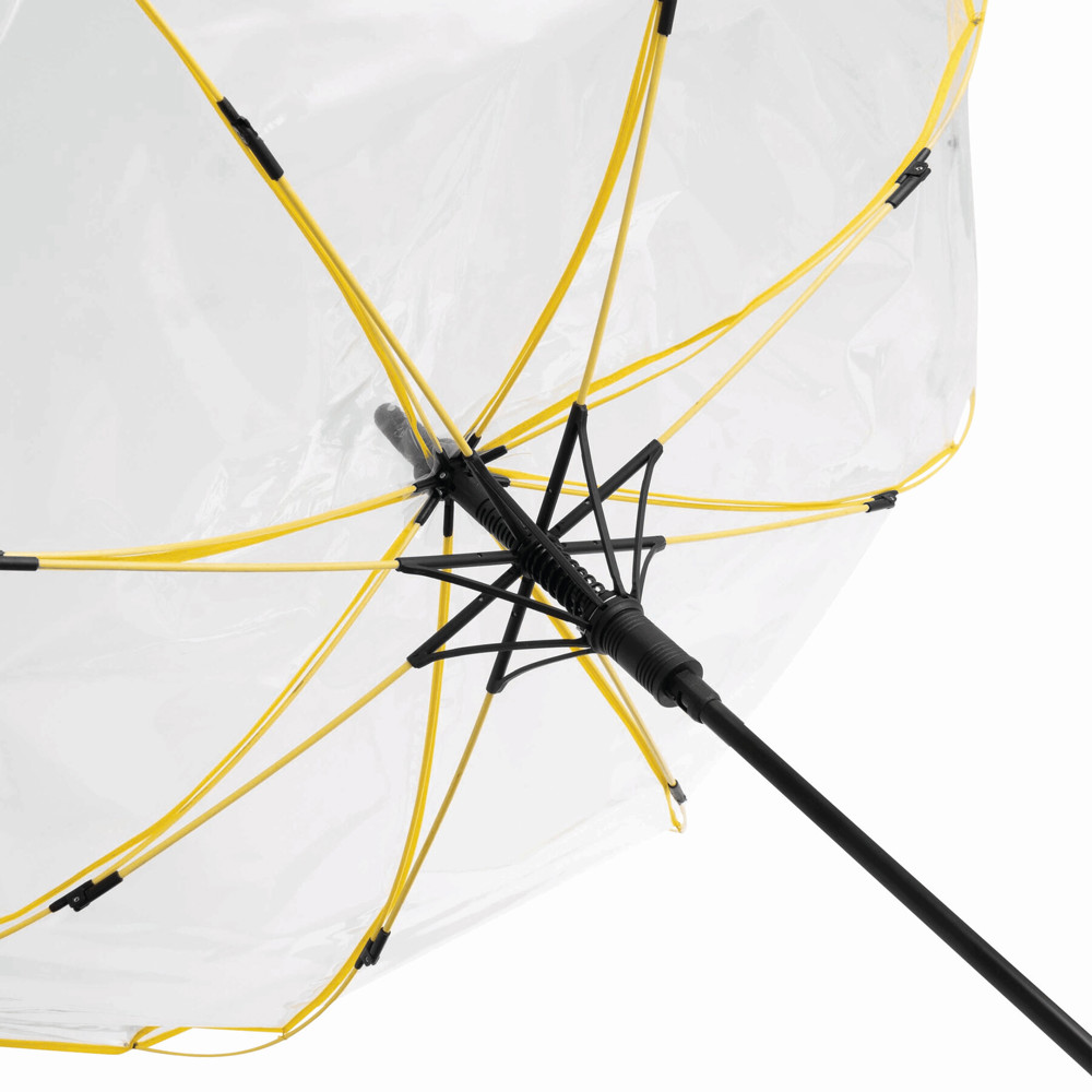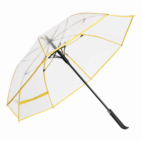 Automatischer Windproof-Stockschirm VIP: Metallstock, farbige Fiberglasspeichen mit Metalltips, Kunststoffspitze, Kunststoffgriff mit integrierter Auslösetaste, transparente POE-Bespannung mit farbiger Paspelierung, Schließband mit Druckknopf