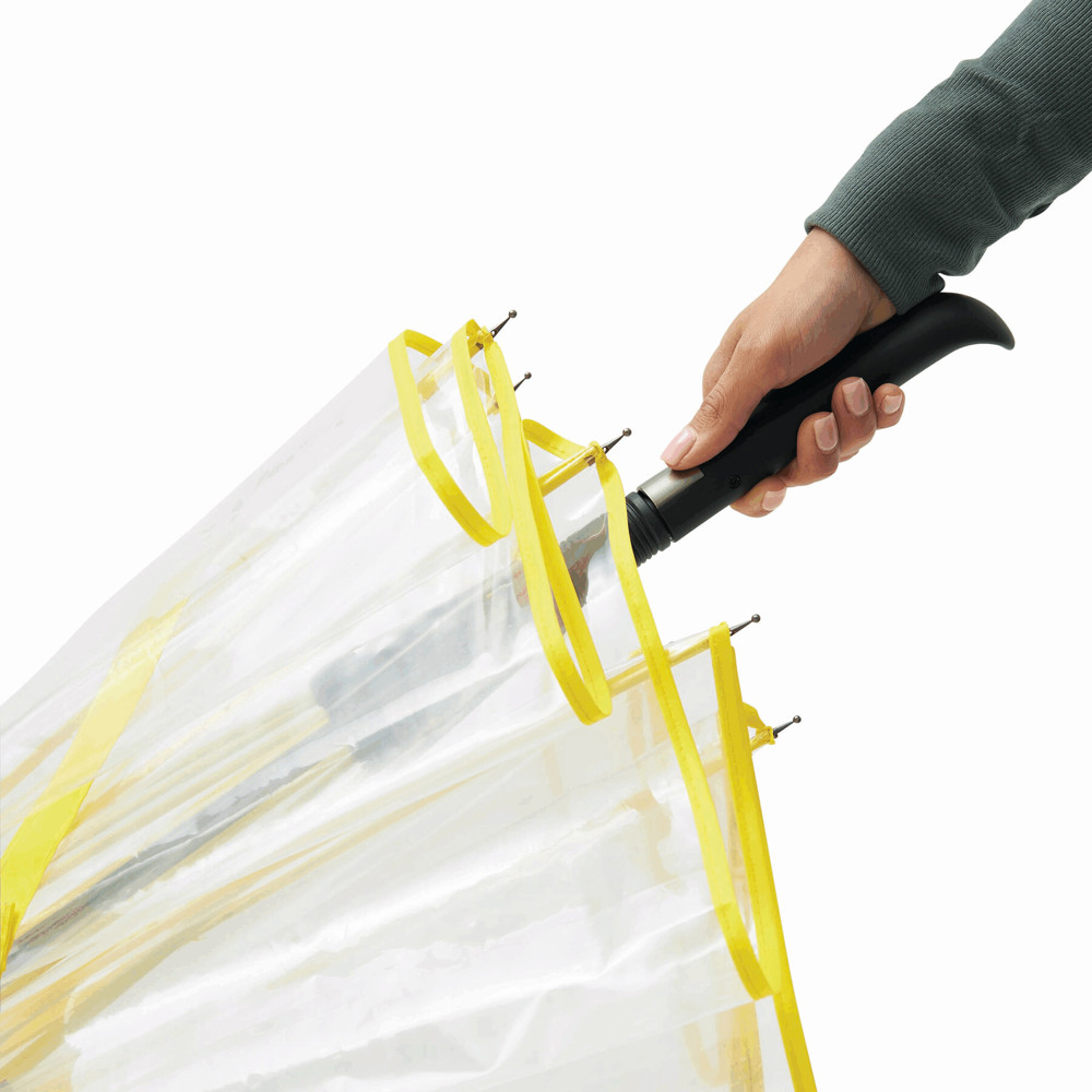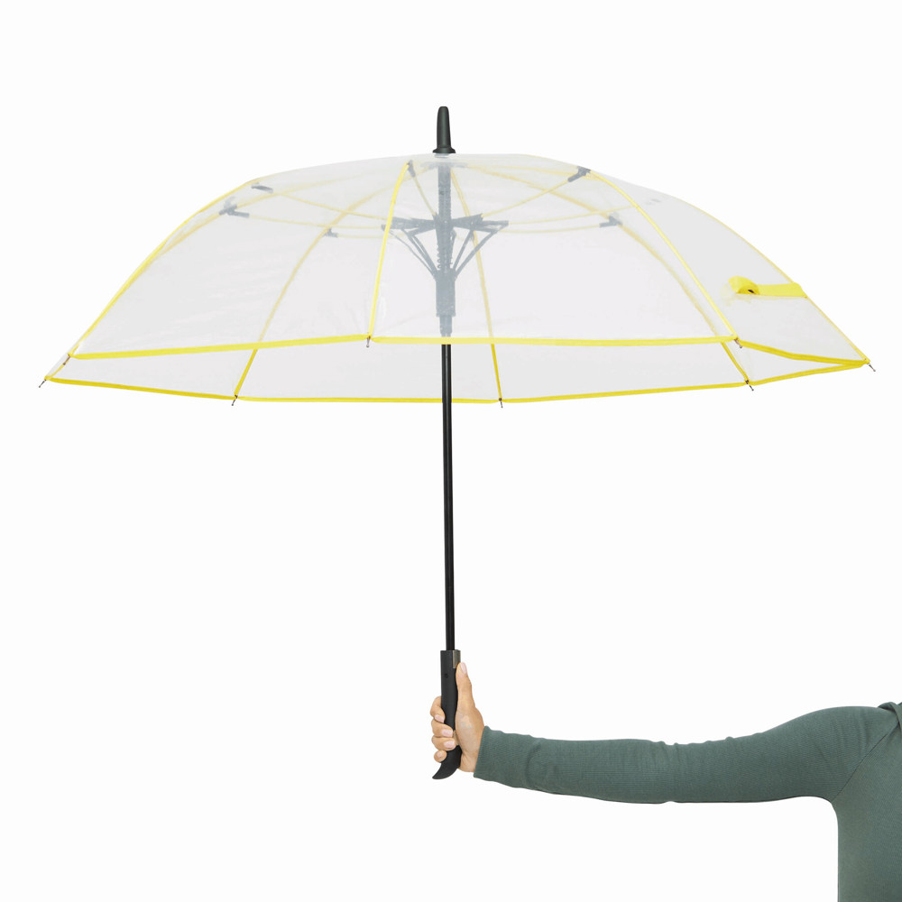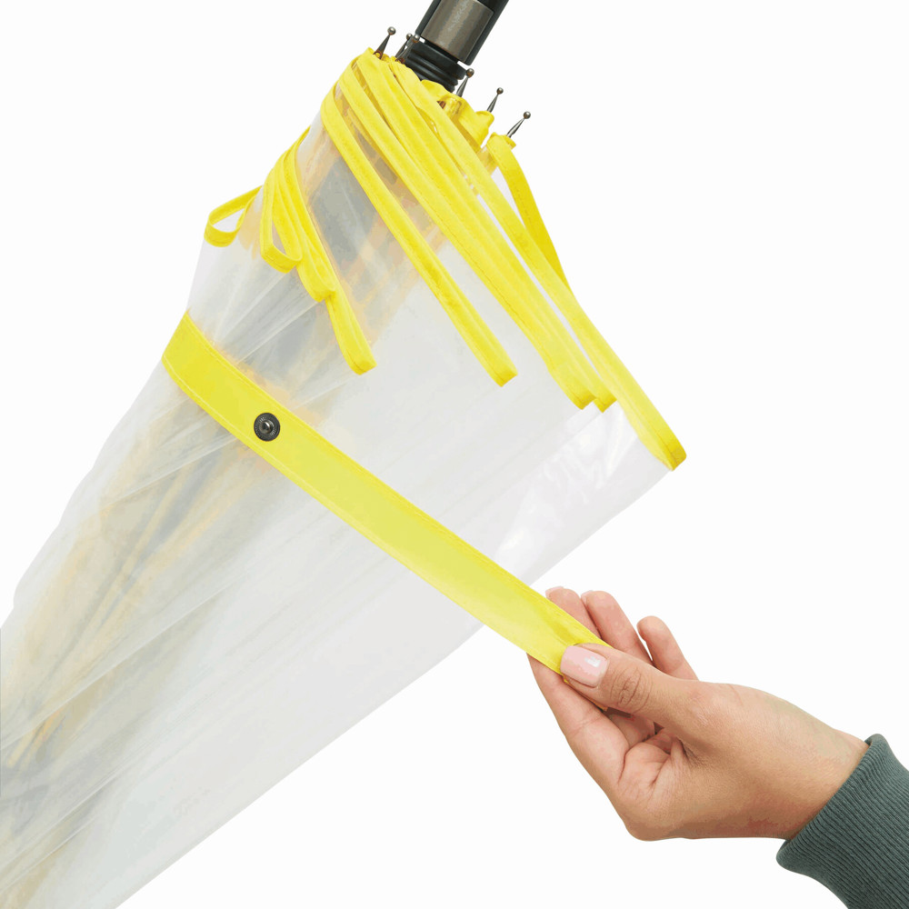 Automatischer Windproof-Stockschirm VIP: Metallstock, farbige Fiberglasspeichen mit Metalltips, Kunststoffspitze, Kunststoffgriff mit integrierter Auslösetaste, transparente POE-Bespannung mit farbiger Paspelierung, Schließband mit Druckknopf