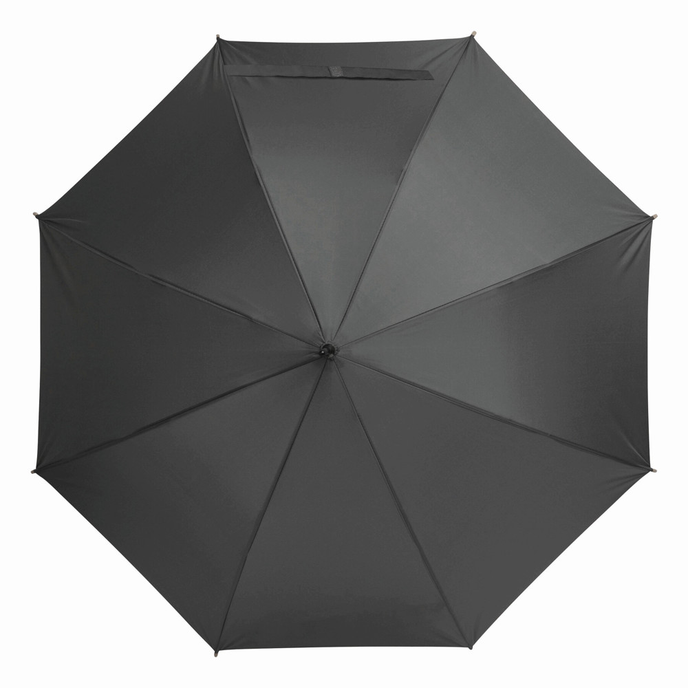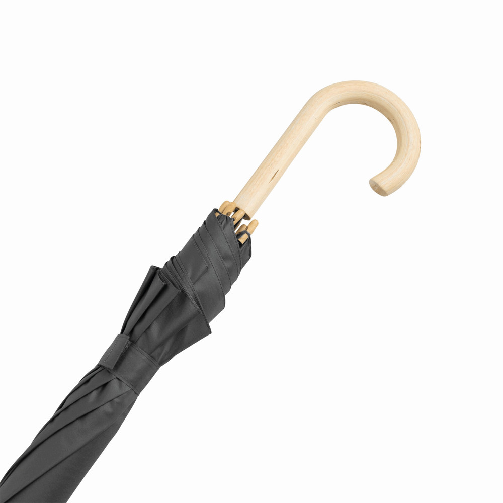 Automatik-Stockschirm LIPSI: Metallstock, Fiberglasspeichen, Holztips und -Rundhakengriff, Polyester-Pongee-Bespannung aus recycelten Kunststoffen / RPET, Schließband mit Klettverschluss
