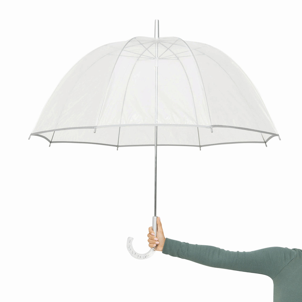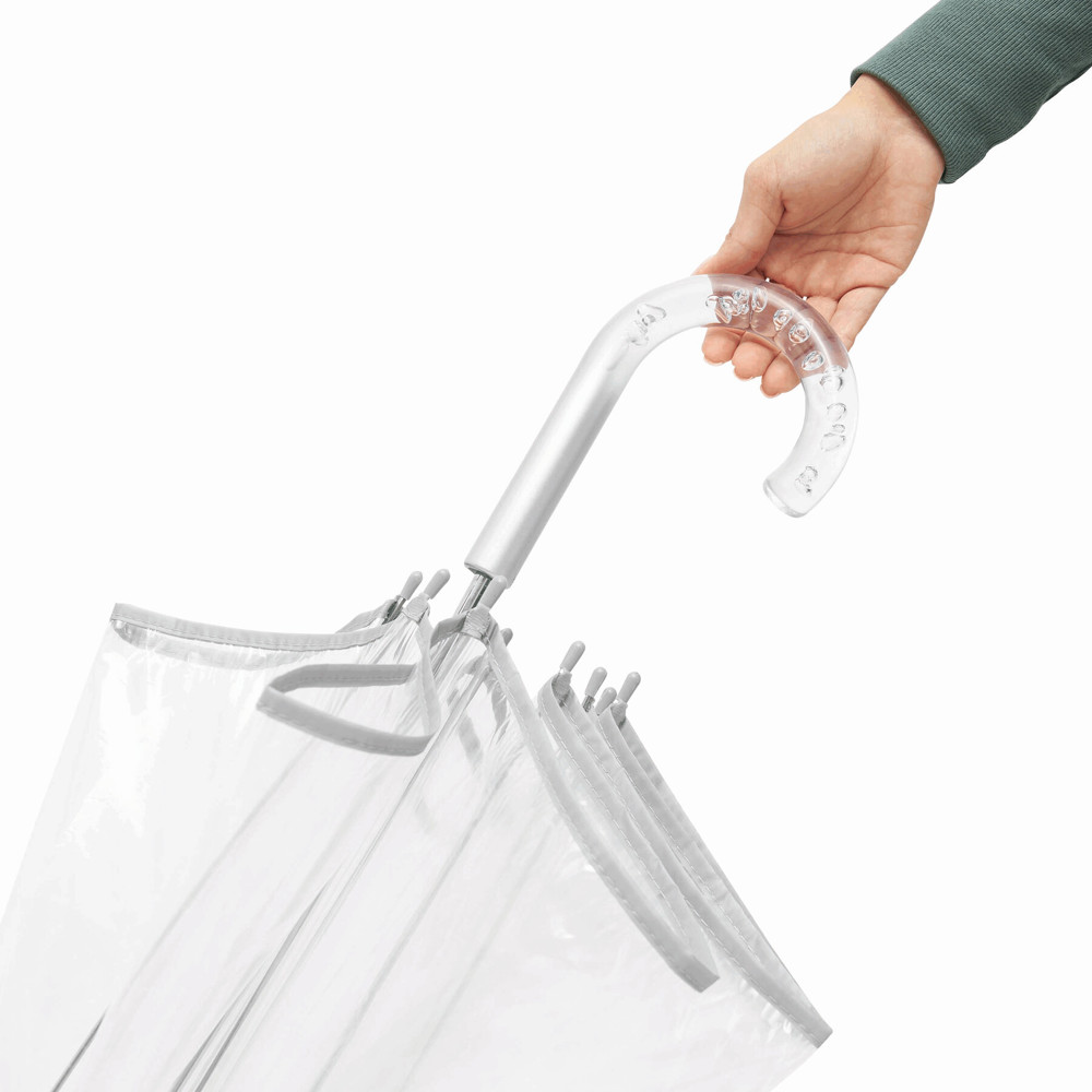 Glockenschirm BELLEVUE: Metallstock und -speichen, Kunststofftips und -spitze, transparenter Kunststoffgriff mit Luftblaseneffekt, transparente POE-Bespannung mit silberfarbener Paspelierung und Druckknopfverschluss