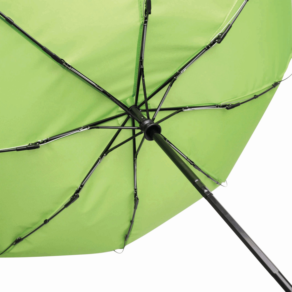 Vollautomatischer Windproof-Taschenschirm CALYPSO in farblich abgestimmtem Futteral: 3-teiliger Metallstock, mit Metall-Kunststoff-Fiberglasspeichen und Metalltips, Bambusgriff mit Handschlaufe, Polyester-Pongee-Bespannung aus recycelten Kunststoffen / RPET, Schließband mit Klettverschluss
