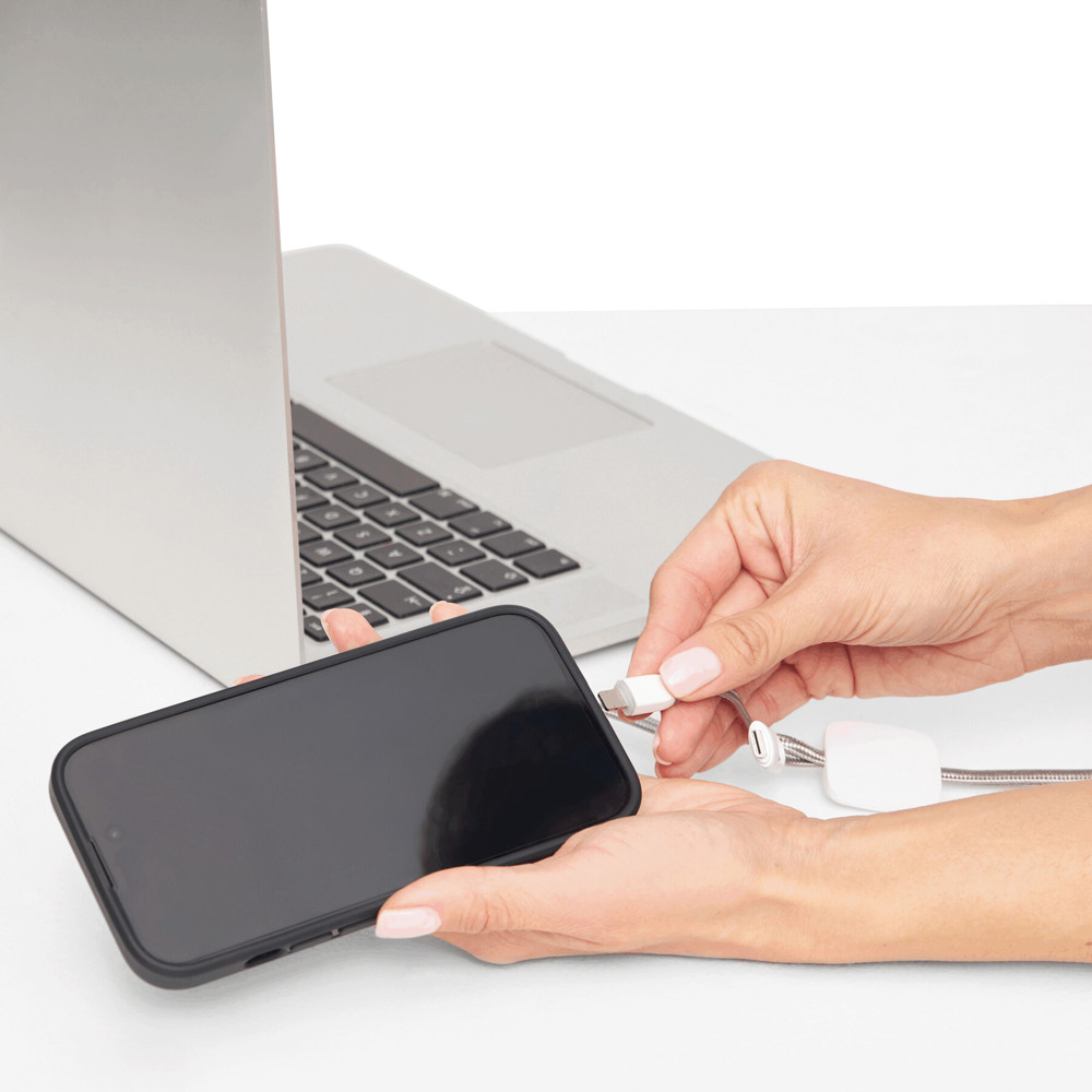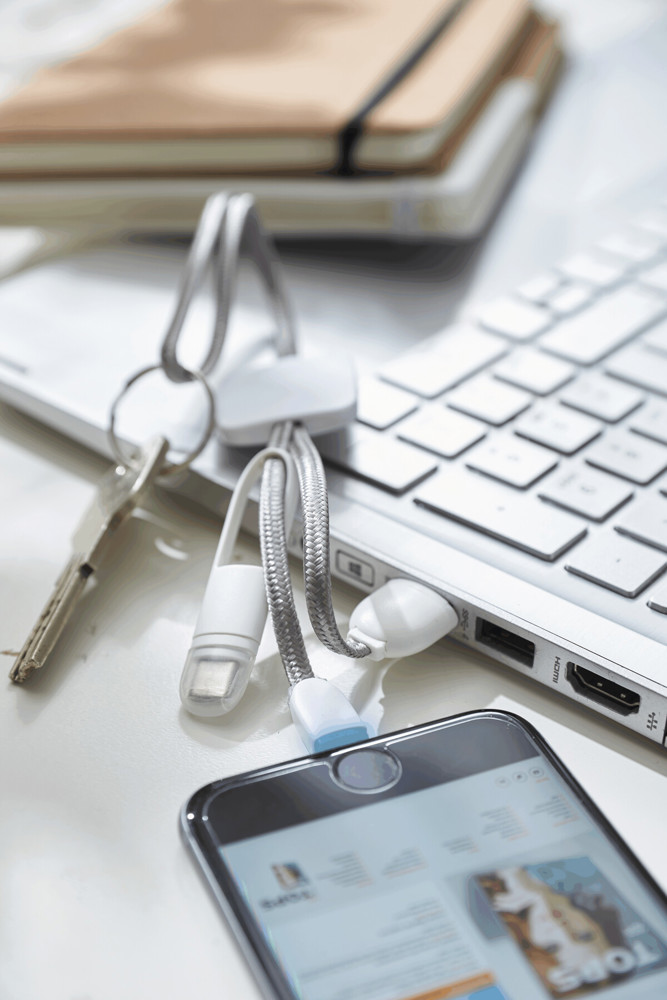 Ladekabel ANNOUNCER: zum Aufladen von Smartphones und USB-betriebenen Geräten, inkl. 2 Ladesteckern (USB Typ C, Kombistecker Micro-USB/Lightning®), Kabellänge ca. 50 cm, Ladestandanzeige ändert die Farbe von rot auf blau, wenn der Ladevorgang fast beendet ist bzw. der Ladestrom 0,3A unterschreitet, mit Schlüsselring