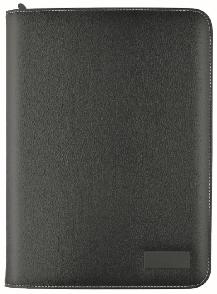 Business Class-Portfolio mit umlaufendem Reißverschluss und schwarzer Metallplakette. DIN A5 Format, VPE 20. 9 Kartenfächer, A5 Blattfach, Reißverschlussfach, Stiftschlaufe, 50 Blatt Block