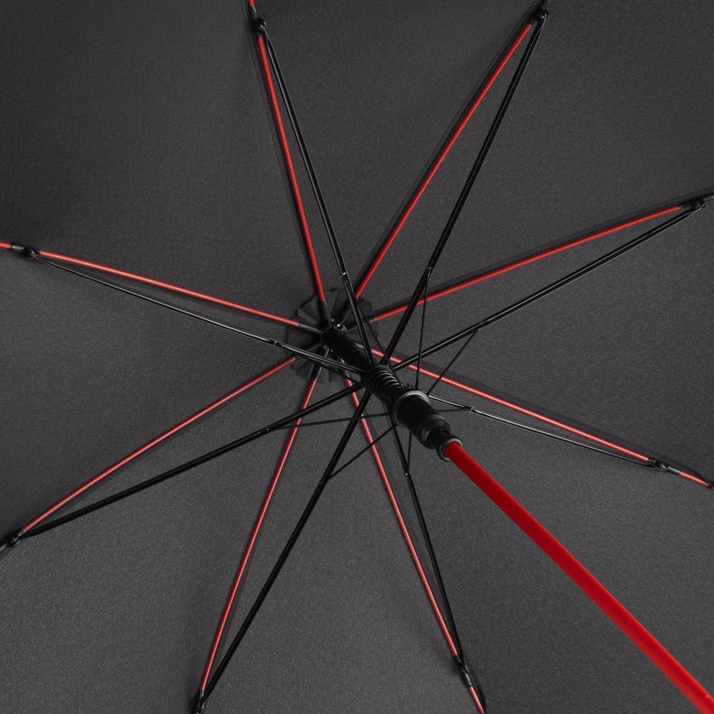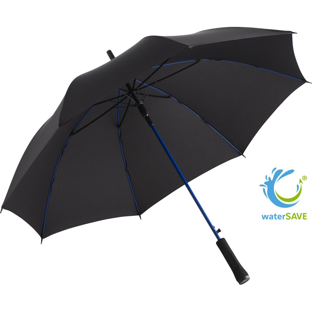 Schicker Automatik-Stockschirm mit farbigem Stock und farbigen Schienen Komfortable Automatik-Funktion zum schnellen Öffnen, Windproof-System für höhere Gestell-Flexibilität und bessere Windsicherheit, flexible Fiberglasschienen, stabiler Stahlstock mit farbiger Kunststoffummantelung, Polyester-Pongee Bezugsmaterial aus recycelten Kunststoffen, umweltfreundlich dank original waterSAVE® Bezugsmaterial, dezente Verzierung des Bezugs durch farbige Nähte, exklusiver Softgriff mit Werbeanbringungsmöglichkeit, Auslösetaste mit Werbeanbringungsmöglichkeit, mit waterSAVE® Label auf dem Schließband. Auch als Taschenschirm (Art. 5644) erhältlich.