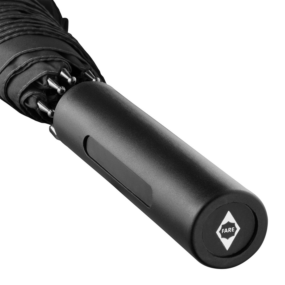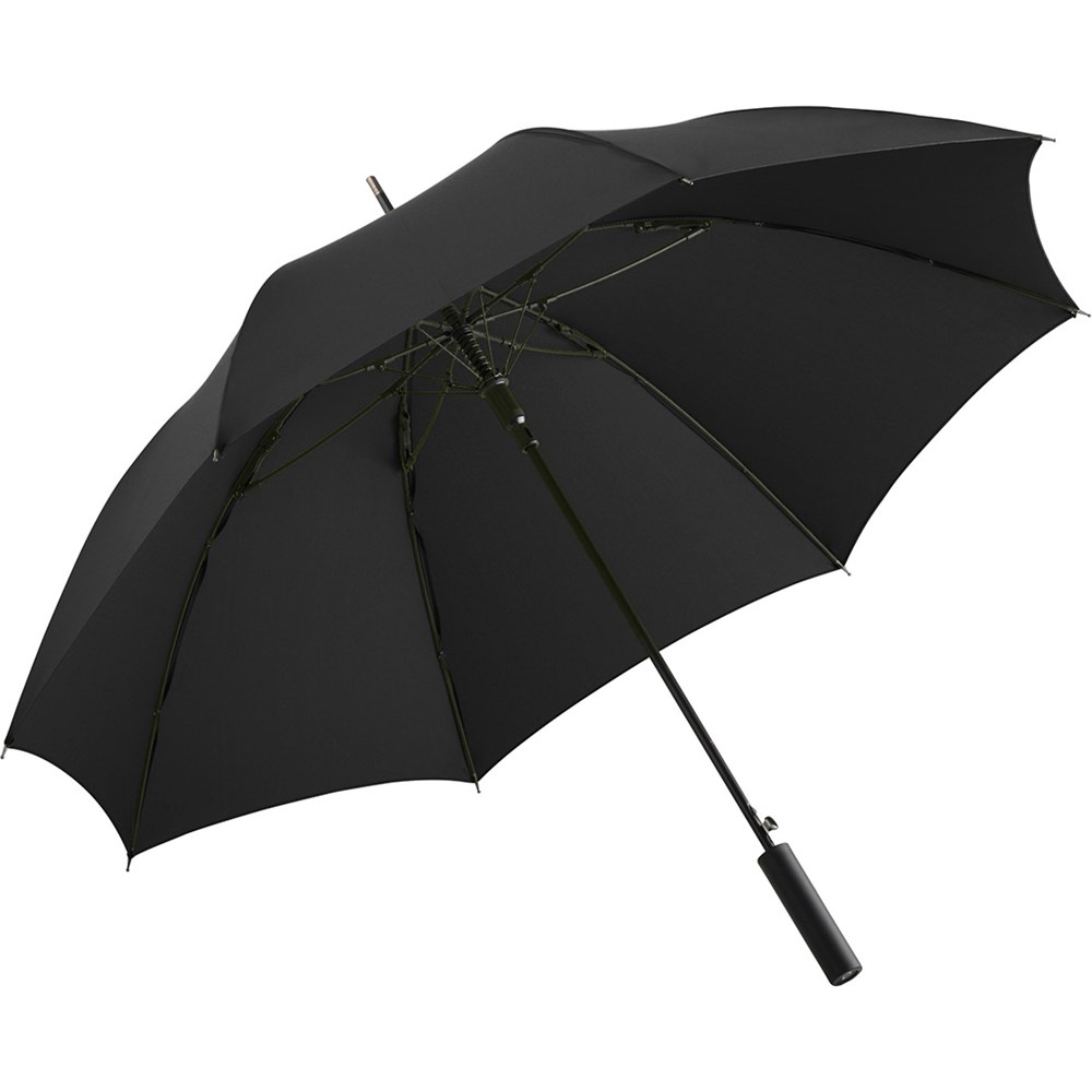 Preislich attraktiver Automatik-Stockschirm mit doppelter Werbeanbringungsmöglichkeit am Griff Komfortable Automatik-Funktion zum schnellen Öffnen, hochwertiges Windproof-PLUS-System für eine maximale Gestell-Flexibilität bei stärkeren Windböen, flexible Fiberglasschienen, gerader Griff mit doppelter Werbeanbringungsmöglichkeit, höherer Korrosionsschutz durch schwarze Galvanisierung des Stahlstocks