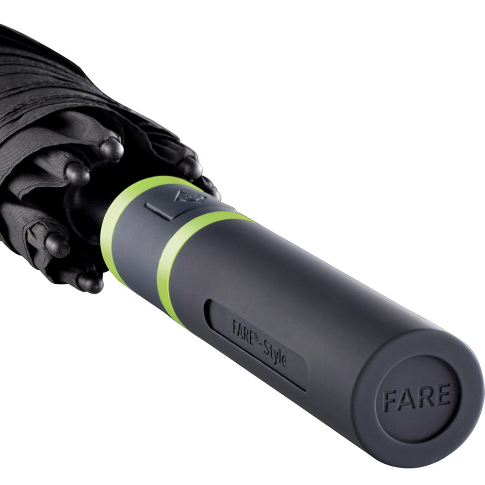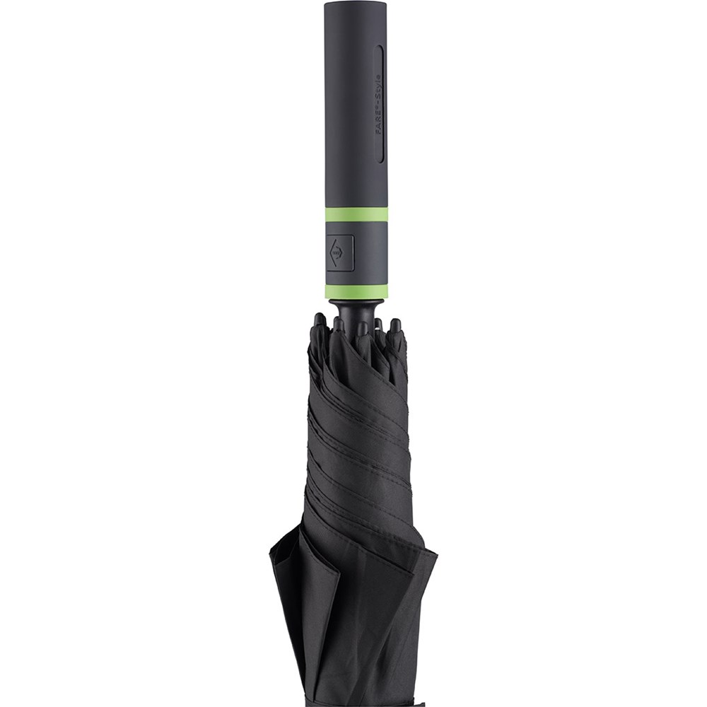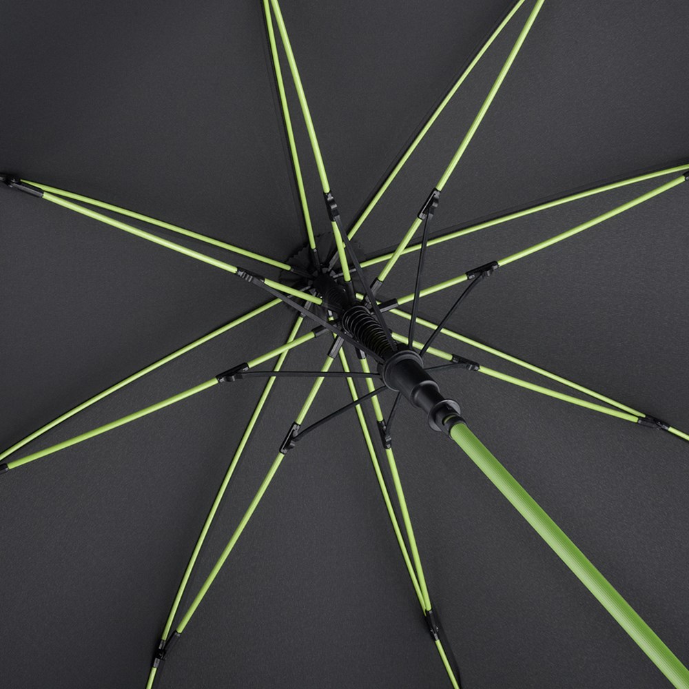 Stylischer Automatik-Gästeschirm für zwei Personen mit farbigem Stock und farbigen Elementen Komfortable Automatik-Funktion zum schnellen Öffnen, hochwertiges Windproof-PLUS-System für eine maximale Gestell-Flexibilität bei stärkeren Windböen, flexible Fiberglasschienen, stabiler Stahlstock mit farbiger Kunststoffummantelung, Polyester-Pongee Bezugsmaterial aus recycelten Kunststoffen, umweltfreundlich dank original waterSAVE Bezugsmaterial, mit waterSAVE®-Label auf dem Schließband, exklusiver gerader Soft-Feel-Griff mit farbigen Griffringen und doppelter Werbeanbringungsmöglichkeit. Auch als Taschenschirm (Art. 5084, 5484, 5584) und Midsize-Schirm (Art. 4784) erhältlich.