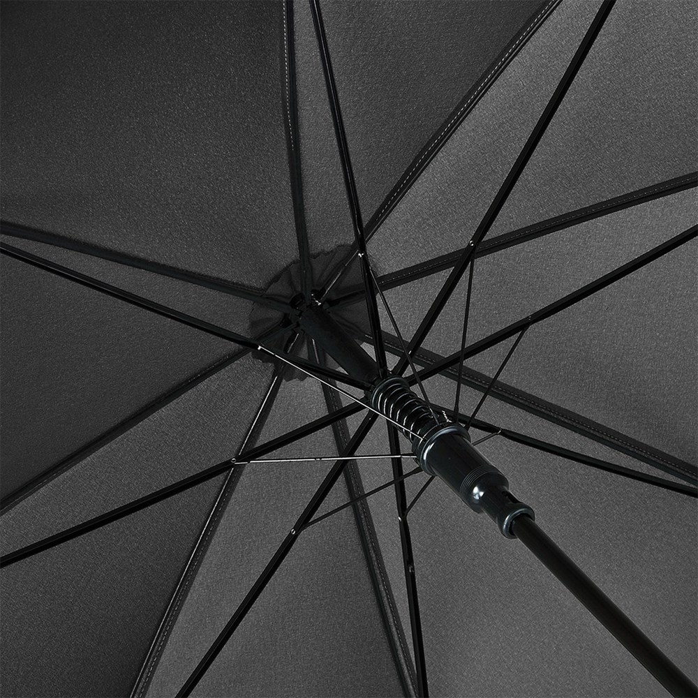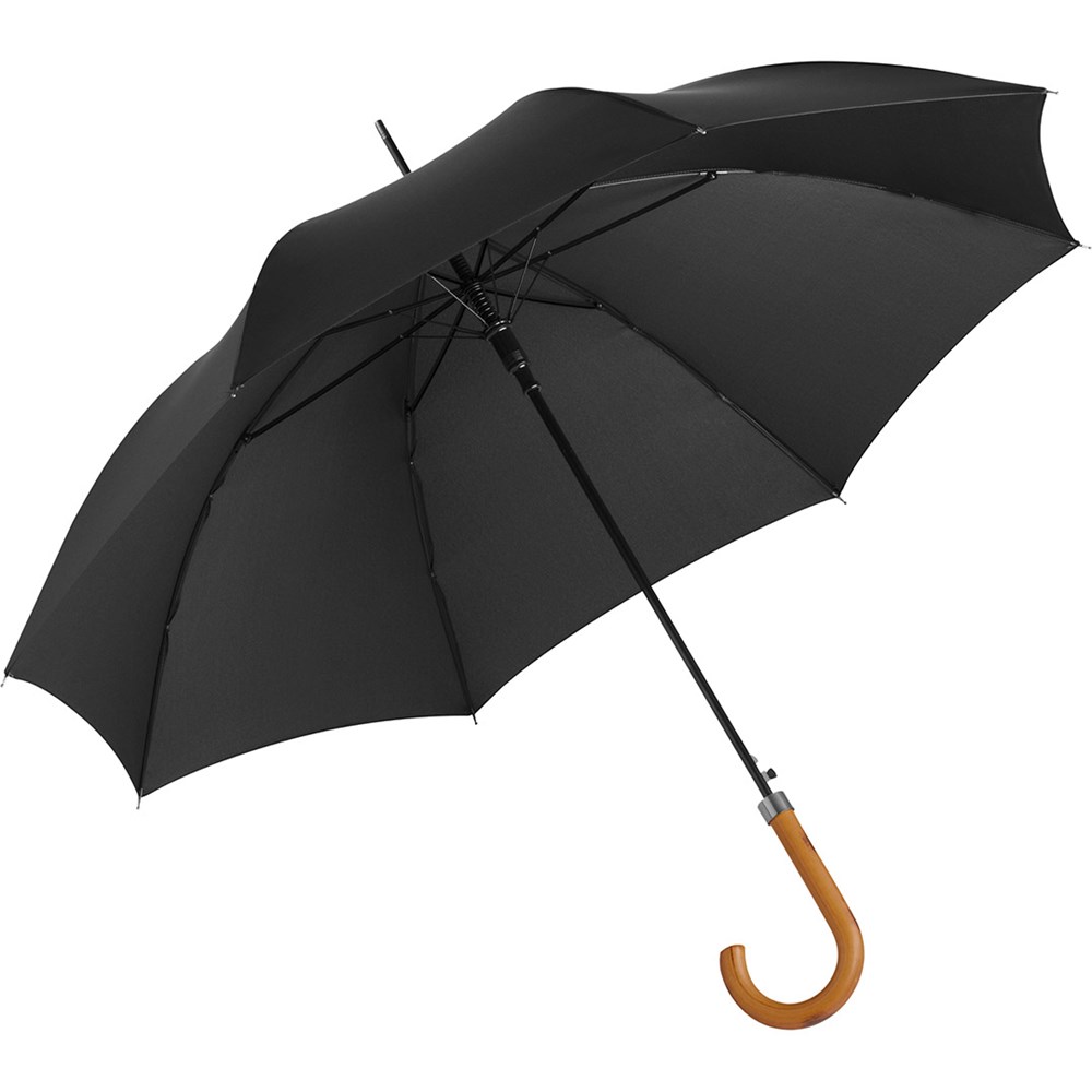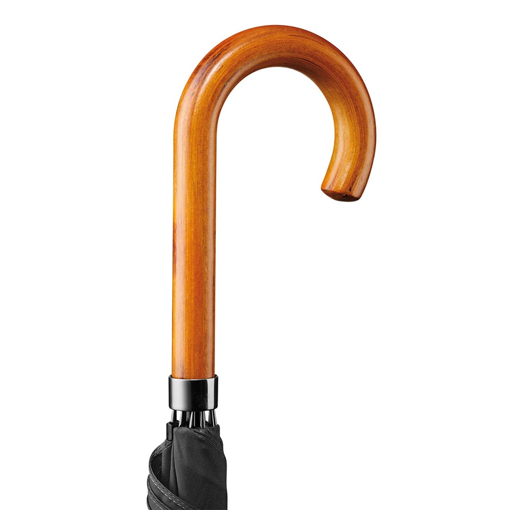 Preislich attraktiver Automatik-Stockschirm mit geflammtem Rundhakengriff aus Echtholz Komfortable Automatik-Funktion zum schnellen Öffnen, Windproof-System für höhere Gestell-Flexibilität und bessere Windsicherheit, flexible Fiberglasschienen, Griff mit laserfähigem Griffring, höherer Korrosionsschutz durch schwarze Galvanisierung des Stahlstocks