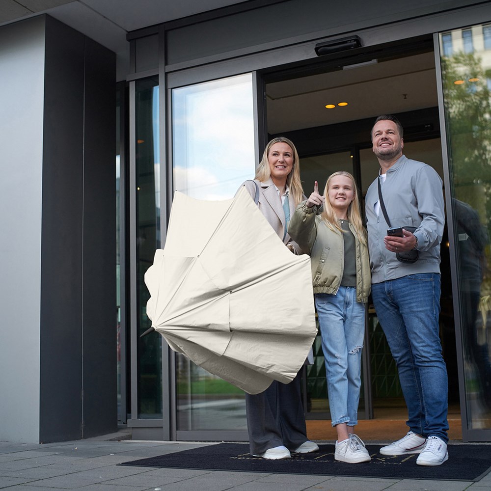 Exklusiver Automatik-Gästeschirm für zwei Personen mit Tropfenmotiv auf dem Fiberglasstock Komfortable Automatik-Funktion zum schnellen Öffnen, hochwertiges Windproof-PLUS-System für eine maximale Gestell-Flexibilität bei stärkeren Windböen, flexible Fiberglasschienen, stabiler Fiberglasstock mit Tropfenmotiv, wassersparend gefärbtes Polyester-Pongee waterSAVE® Bezugsmaterial aus recycelten Kunststoffen, mit waterSAVE® Label auf dem Schließband (bei neuen Chargen), von innen beschichteter Bezug, überlappender Ventilationsbezug zur Regulierung von Überdruck durch stärkere Windböen, gerader Softgriff mit farbigen Griffringen, integrierter Auslösetaste und Werbeanbringungsmöglichkeit, Tropfenmotiv und Griffringe farblich auf den Bezug abgestimmt