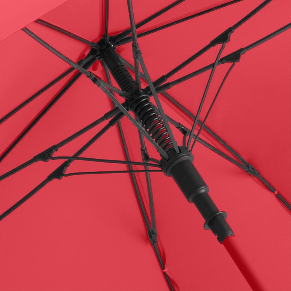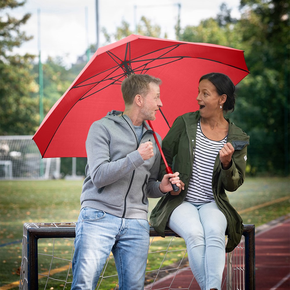 Quadratischer Gästeschirm für zwei Personen Komfortable Automatik-Funktion zum schnellen Öffnen, hochwertiges Windproof-PLUS-System für eine maximale Gestell-Flexibilität bei stärkeren Windböen, flexible Fiberglasschienen, farbige Ummantelung des Stahlstocks, gerader Soft-Touch-Griff mit integrierter Auslösetaste und doppelter Werbeanbringungsmöglichkeit, gastfreundlicher großer Durchmesser
