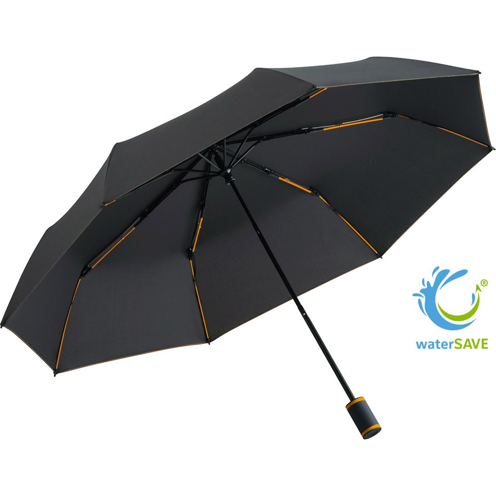 Stylischer Handöffner-Taschenschirm in Schwarz mit farbigen Elementen Einfache Handhabung durch Sicherheitsschieber, hochwertiges Windproof-PLUS-System für eine maximale Gestell-Flexibilität bei stärkeren Windböen, flexible Fiberglasschienen, Polyester-Pongee Bezugsmaterial aus recycelten Kunststoffen, umweltfreundlich dank original waterSAVE Bezugsmaterial, mit waterSAVE®-Label auf dem Schließband, ansprechendes Design durch farbige Schienen, Griffringe und Nähte, Soft-Feel-Griff mit Werbeanbringungsmöglichkeit, Futteral mit farbiger Naht. Auch als Taschenschirm (Art. 5484, 5584), Midsize-Schirm (Art. 4784) und Gästeschirm (Art. 2384) erhältlich.