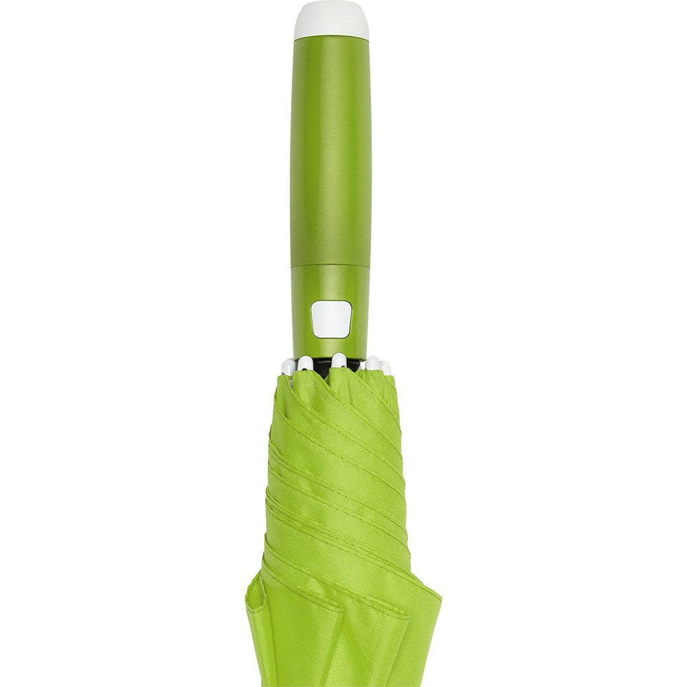 Stylischer Automatik-Stockschirm in mittlerer Größe mit weißem Stock, Schienen und Kunststoff-Spitzen Komfortable Automatik-Funktion zum schnellen Öffnen, hochwertiges Windproof-PLUS-System für eine maximale Gestell-Flexibilität bei stärkeren Windböen, flexible Fiberglasschienen in weiß, stabiler Stahlstock mit weißer Kunststoffummantelung, Polyester-Pongee Bezugsmaterial aus recycelten Kunststoffen, weiße Kunststoff-Spitzen, formschöner Soft-Feel-Griff mit integrierter Auslösetaste und Werbeanbringungsmöglichkeit