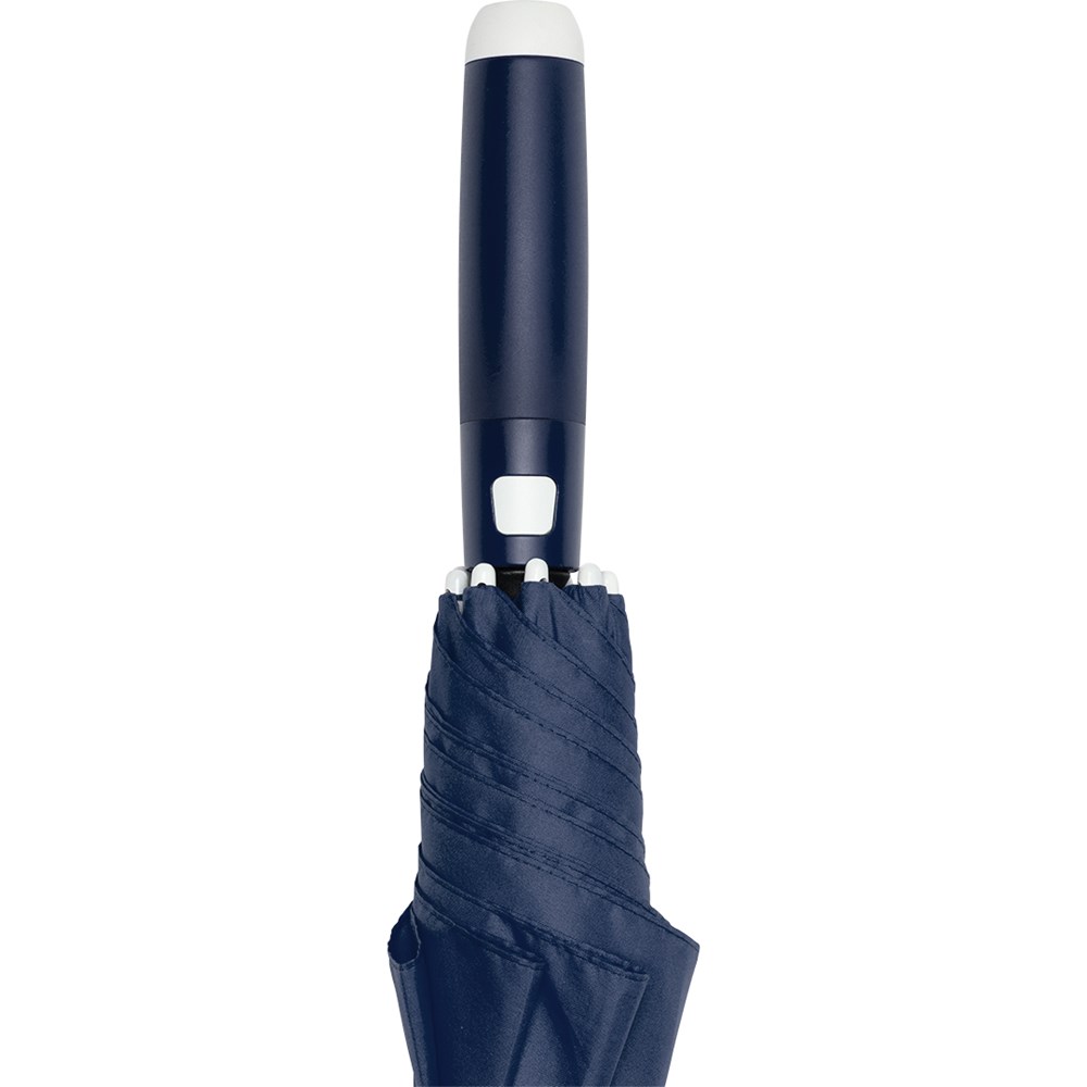 Stylischer Automatik-Stockschirm in mittlerer Größe mit weißem Stock, Schienen und Kunststoff-Spitzen Komfortable Automatik-Funktion zum schnellen Öffnen, hochwertiges Windproof-PLUS-System für eine maximale Gestell-Flexibilität bei stärkeren Windböen, flexible Fiberglasschienen in weiß, stabiler Stahlstock mit weißer Kunststoffummantelung, Polyester-Pongee Bezugsmaterial aus recycelten Kunststoffen, weiße Kunststoff-Spitzen, formschöner Soft-Feel-Griff mit integrierter Auslösetaste und Werbeanbringungsmöglichkeit