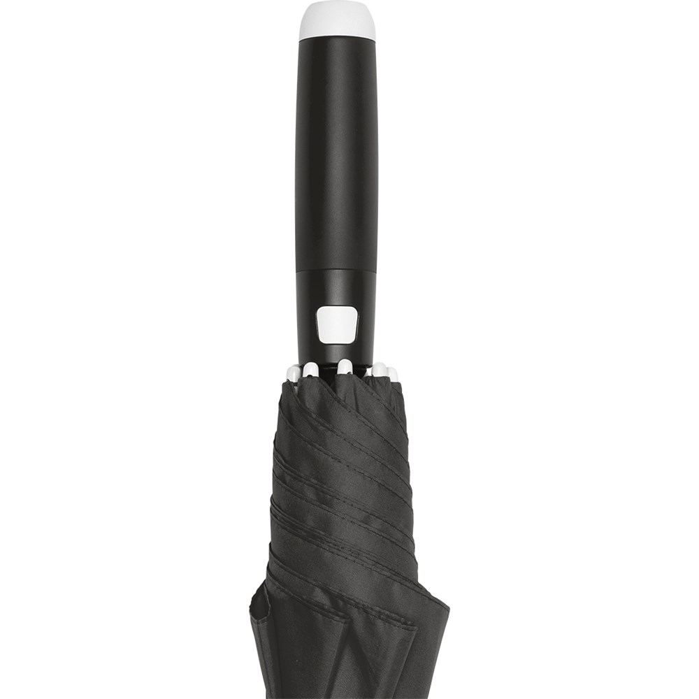 Stylischer Automatik-Stockschirm in mittlerer Größe mit weißem Stock, Schienen und Kunststoff-Spitzen Komfortable Automatik-Funktion zum schnellen Öffnen, hochwertiges Windproof-PLUS-System für eine maximale Gestell-Flexibilität bei stärkeren Windböen, flexible Fiberglasschienen in weiß, stabiler Stahlstock mit weißer Kunststoffummantelung, Polyester-Pongee Bezugsmaterial aus recycelten Kunststoffen, weiße Kunststoff-Spitzen, formschöner Soft-Feel-Griff mit integrierter Auslösetaste und Werbeanbringungsmöglichkeit