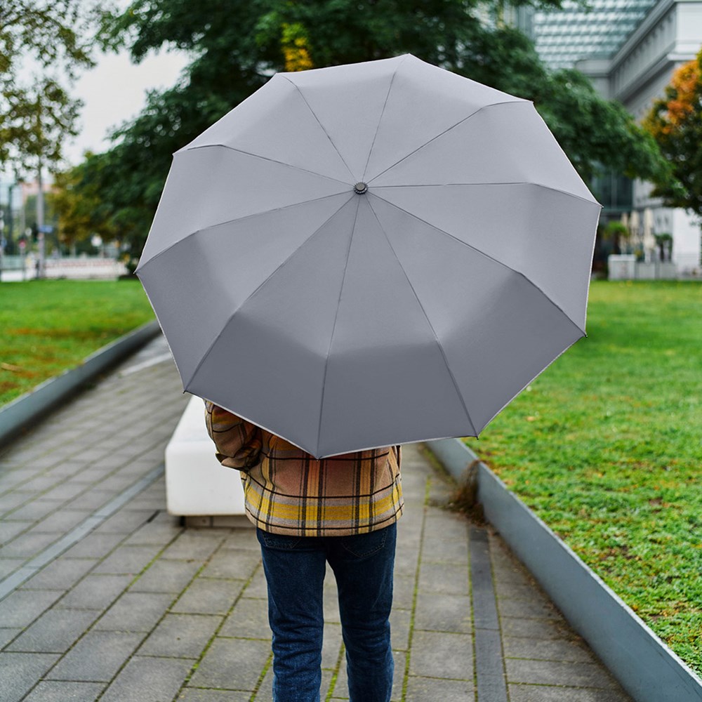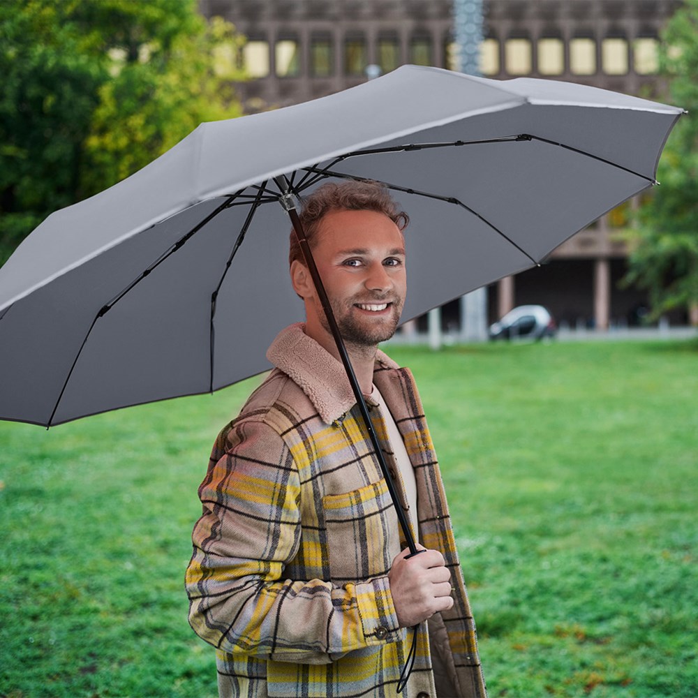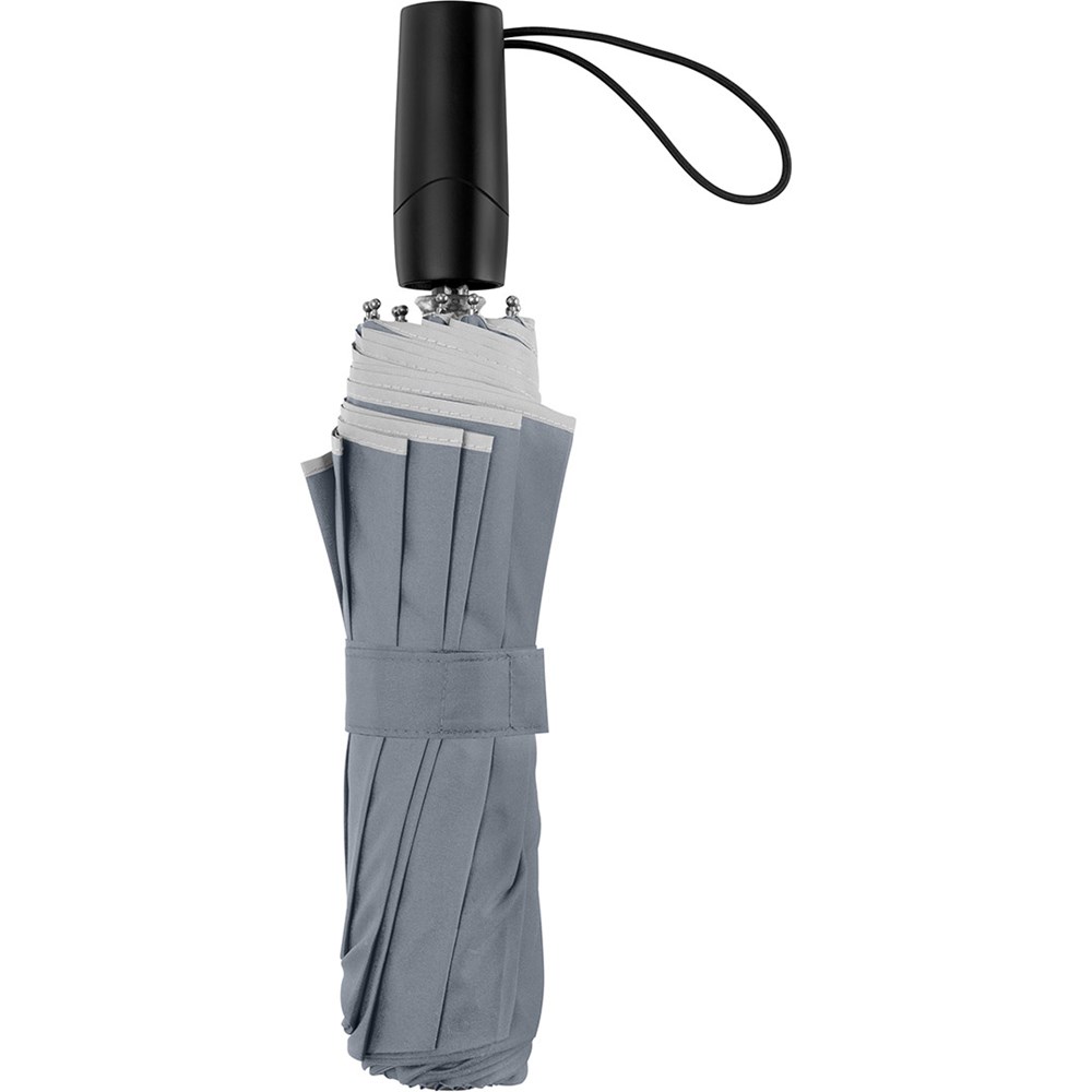 Schicker Handöffner-Taschenschirm in Übergröße mit modisch reflektierender Paspelierung Einfache Handhabung durch Sicherheitsschieber, hochwertiges Windproof-PLUS-System für eine maximale Gestell-Flexibilität bei stärkeren Windböen, besondere Schirmform durch 10 Segmente, Bezug mit modischer Reflexpaspel in Silber, handsympathischer Soft-Feel-Griff mit elastischer Tragekordel und Werbeanbringungsmöglichkeit, gastfreundlicher Durchmesser, Futteral mit modischer Reflexpaspel