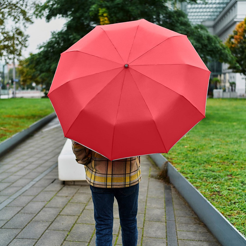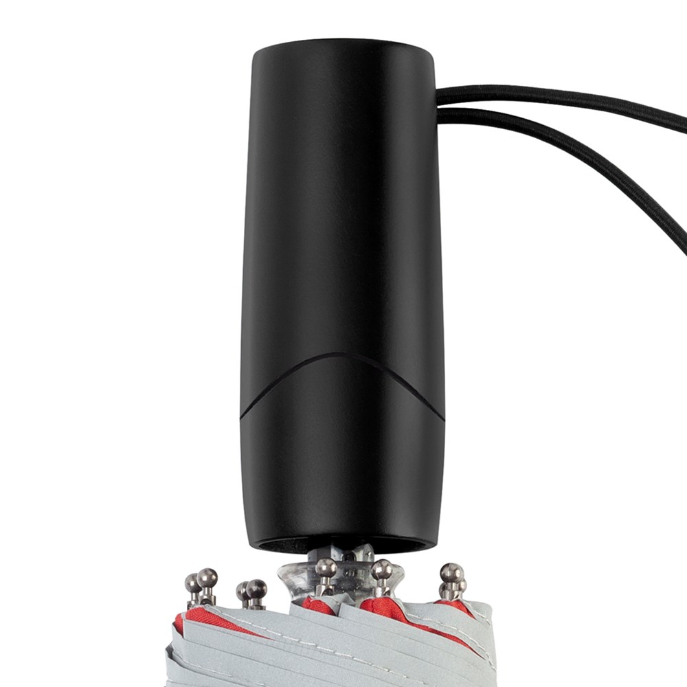 Schicker Handöffner-Taschenschirm in Übergröße mit modisch reflektierender Paspelierung Einfache Handhabung durch Sicherheitsschieber, hochwertiges Windproof-PLUS-System für eine maximale Gestell-Flexibilität bei stärkeren Windböen, besondere Schirmform durch 10 Segmente, Bezug mit modischer Reflexpaspel in Silber, handsympathischer Soft-Feel-Griff mit elastischer Tragekordel und Werbeanbringungsmöglichkeit, gastfreundlicher Durchmesser, Futteral mit modischer Reflexpaspel