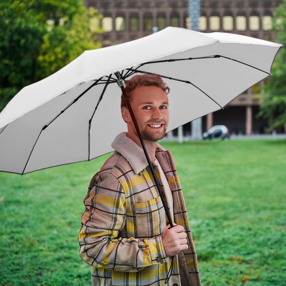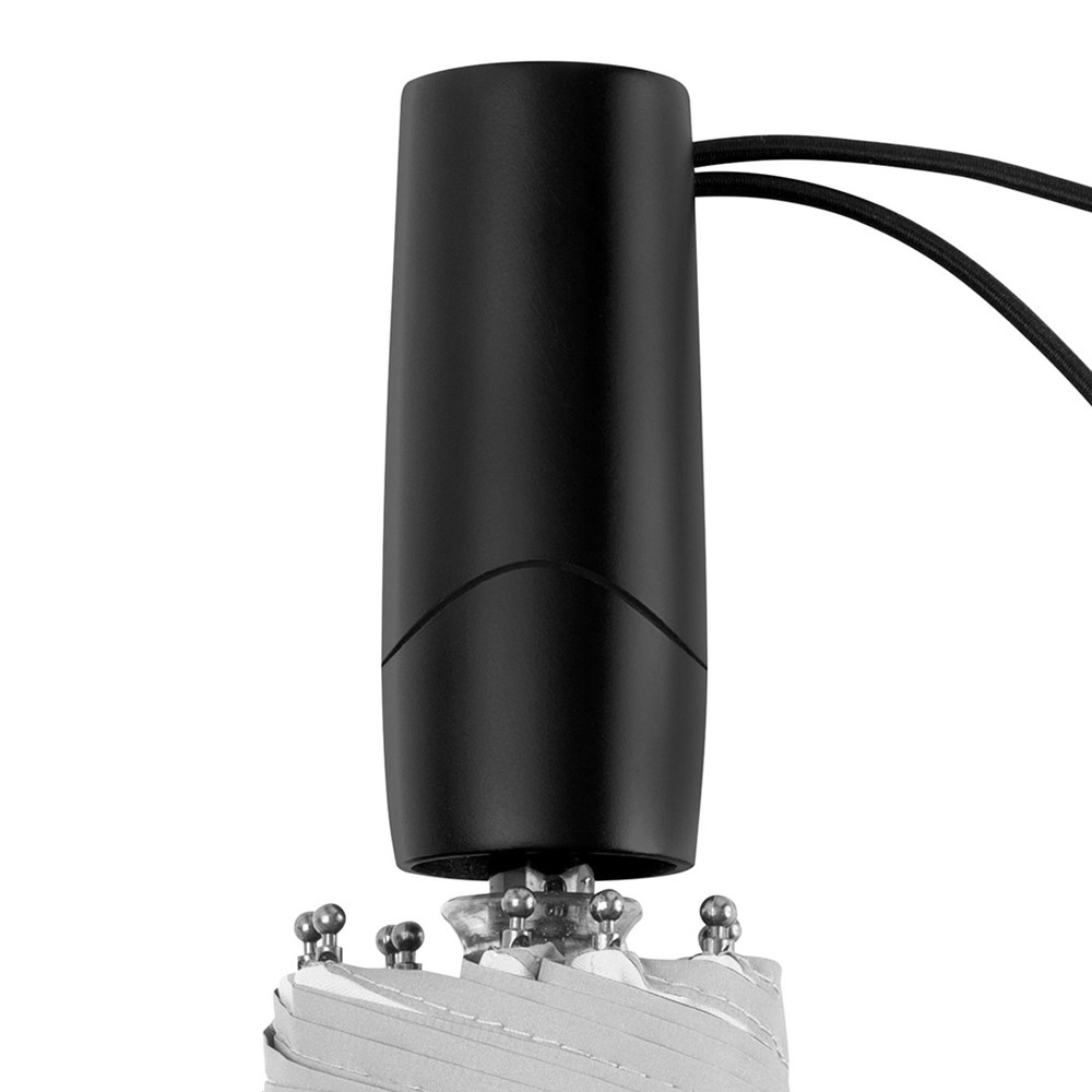 Schicker Handöffner-Taschenschirm in Übergröße mit modisch reflektierender Paspelierung Einfache Handhabung durch Sicherheitsschieber, hochwertiges Windproof-PLUS-System für eine maximale Gestell-Flexibilität bei stärkeren Windböen, besondere Schirmform durch 10 Segmente, Bezug mit modischer Reflexpaspel in Silber, handsympathischer Soft-Feel-Griff mit elastischer Tragekordel und Werbeanbringungsmöglichkeit, gastfreundlicher Durchmesser, Futteral mit modischer Reflexpaspel