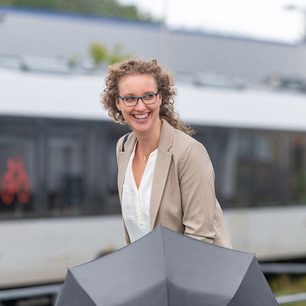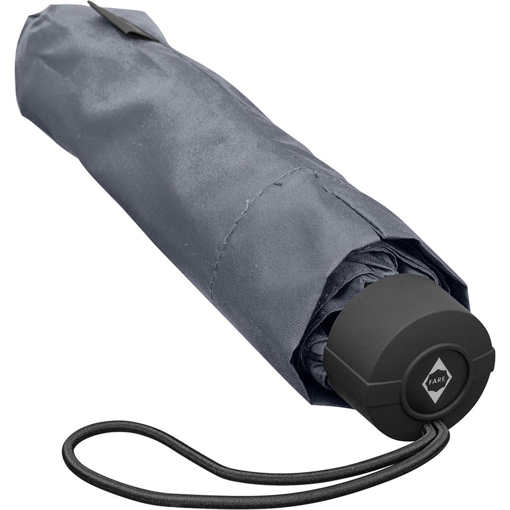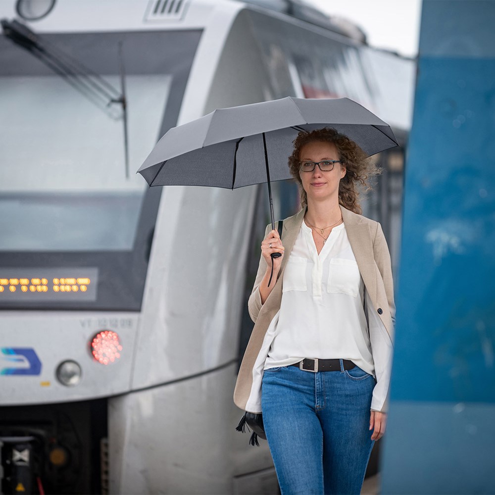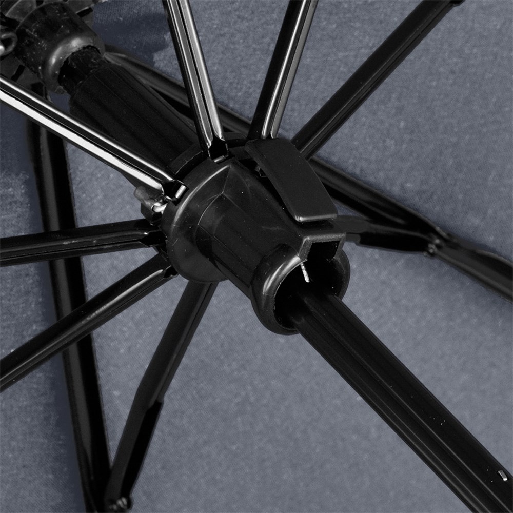 Preislich attraktiver Handöffner-Taschenschirm Einfache Handhabung durch Sicherheitsschieber, Windproof-System für höhere Gestell-Flexibilität und bessere Windsicherheit, Soft-Touch-Griff mit elastischer Tragekordel und Werbeanbringungsmöglichkeit
