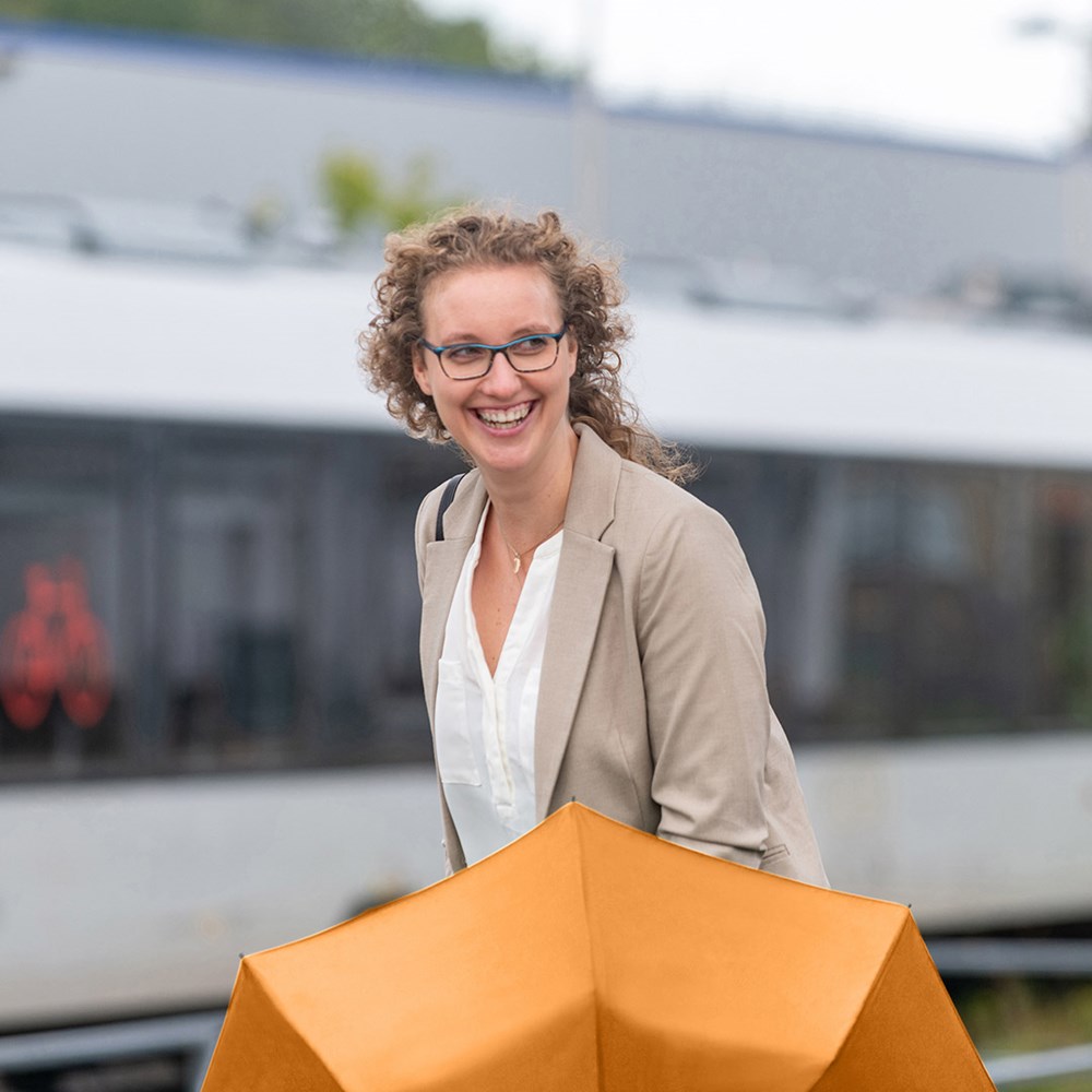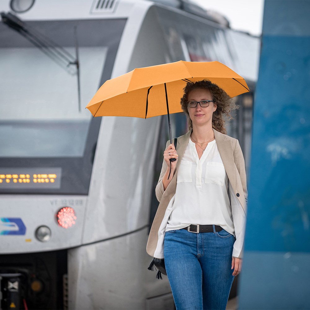 Preislich attraktiver Handöffner-Taschenschirm Einfache Handhabung durch Sicherheitsschieber, Windproof-System für höhere Gestell-Flexibilität und bessere Windsicherheit, Soft-Touch-Griff mit elastischer Tragekordel und Werbeanbringungsmöglichkeit