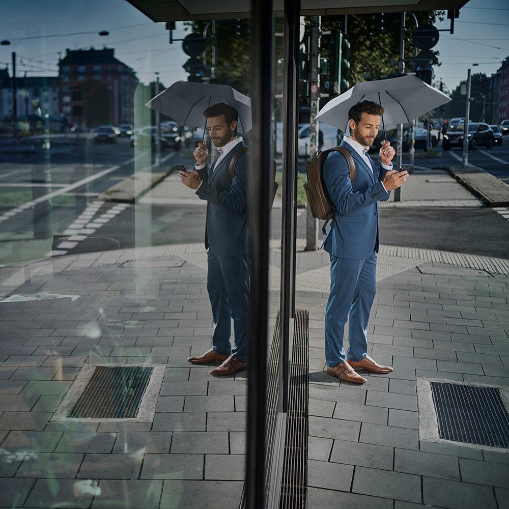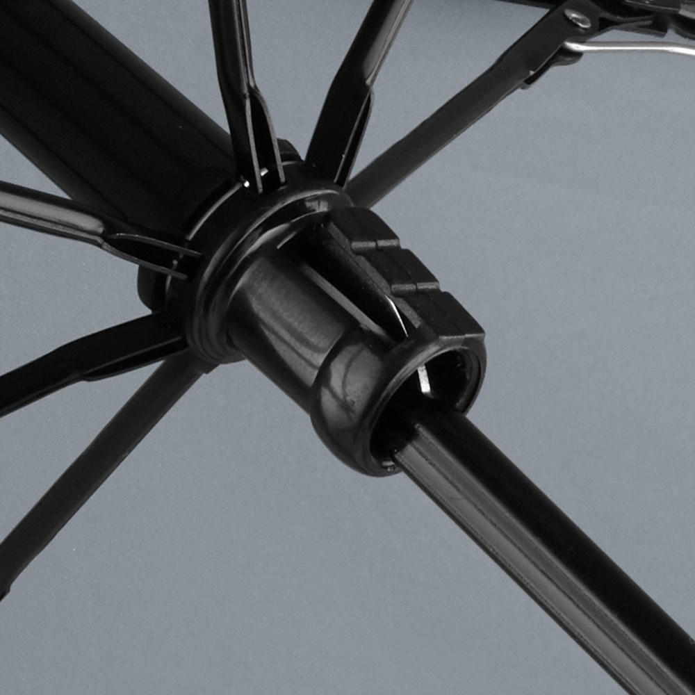 Filigraner Handöffner-Taschenschirm in ultraleichter Ausführung Einfache Handhabung durch Sicherheitsschieber, hochwertiges Windproof-PLUS-System für eine maximale Gestell-Flexibilität bei stärkeren Windböen, schwarzer Aluminiumstock, Polyester-Pongee Bezugsmaterial aus recycelten Kunststoffen, extra leichter Bezug, matt-schwarzer Kunststoffgriff aus recyceltem ABS (rABS) mit Werbeanbringungsmöglichkeit, handtaschentauglich durch ultraleichtes Gewicht und kompakte Größe