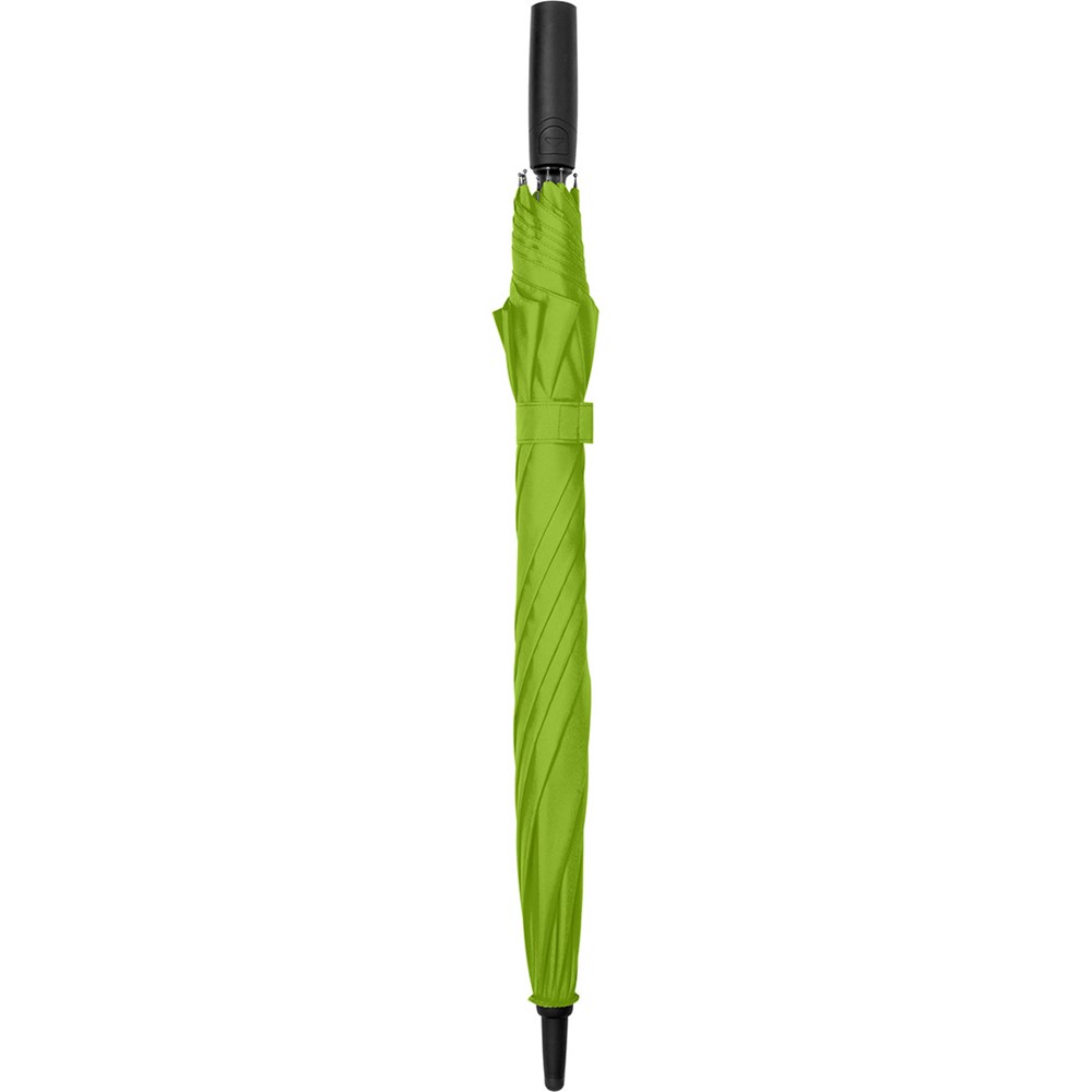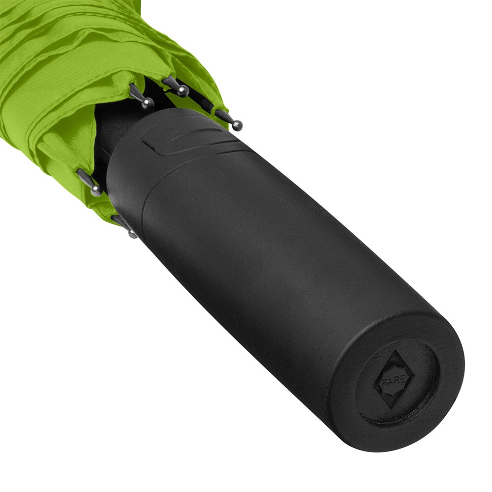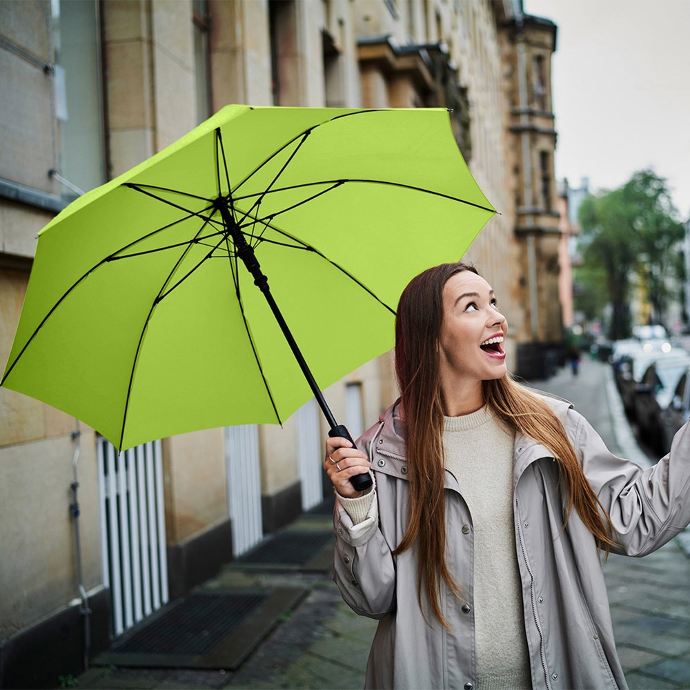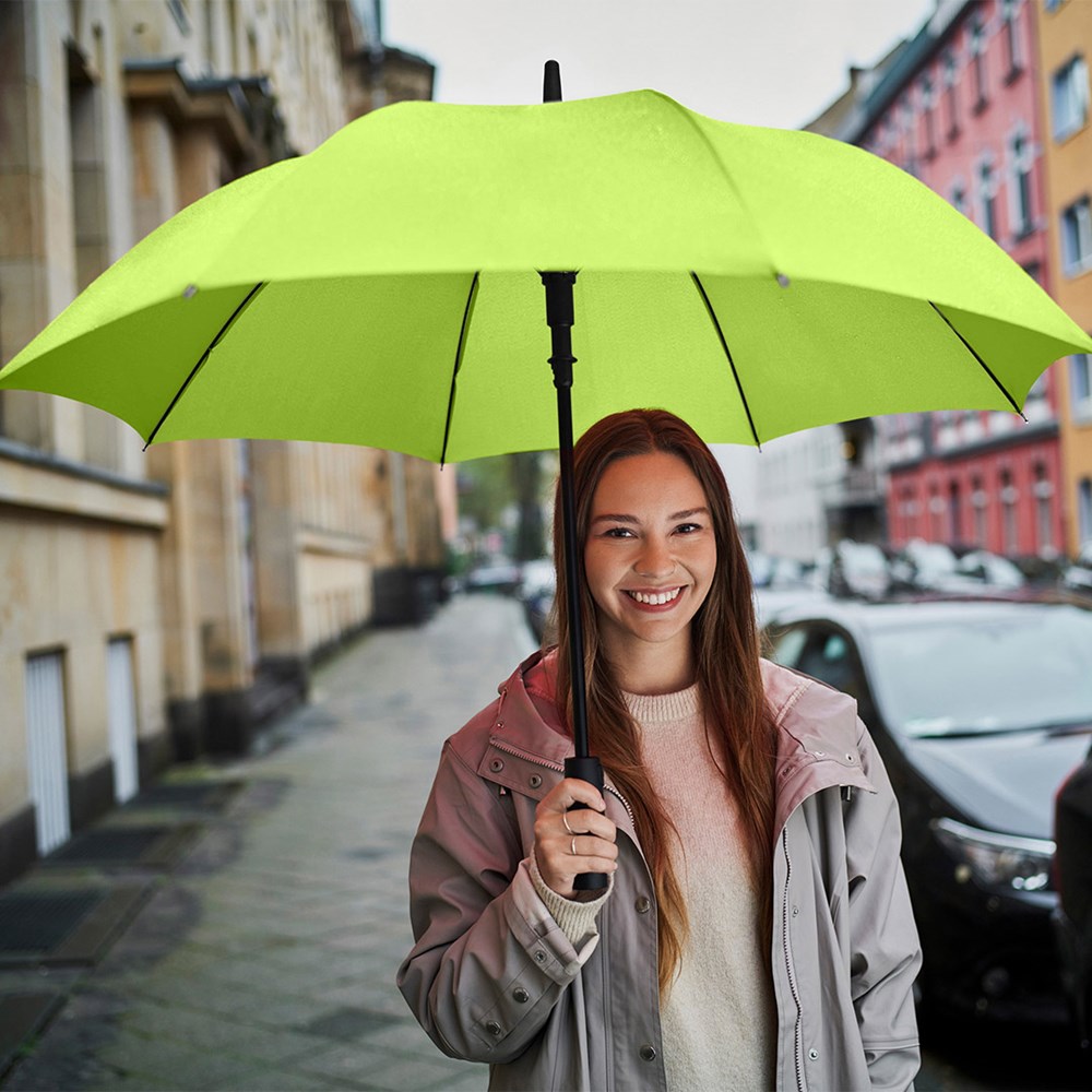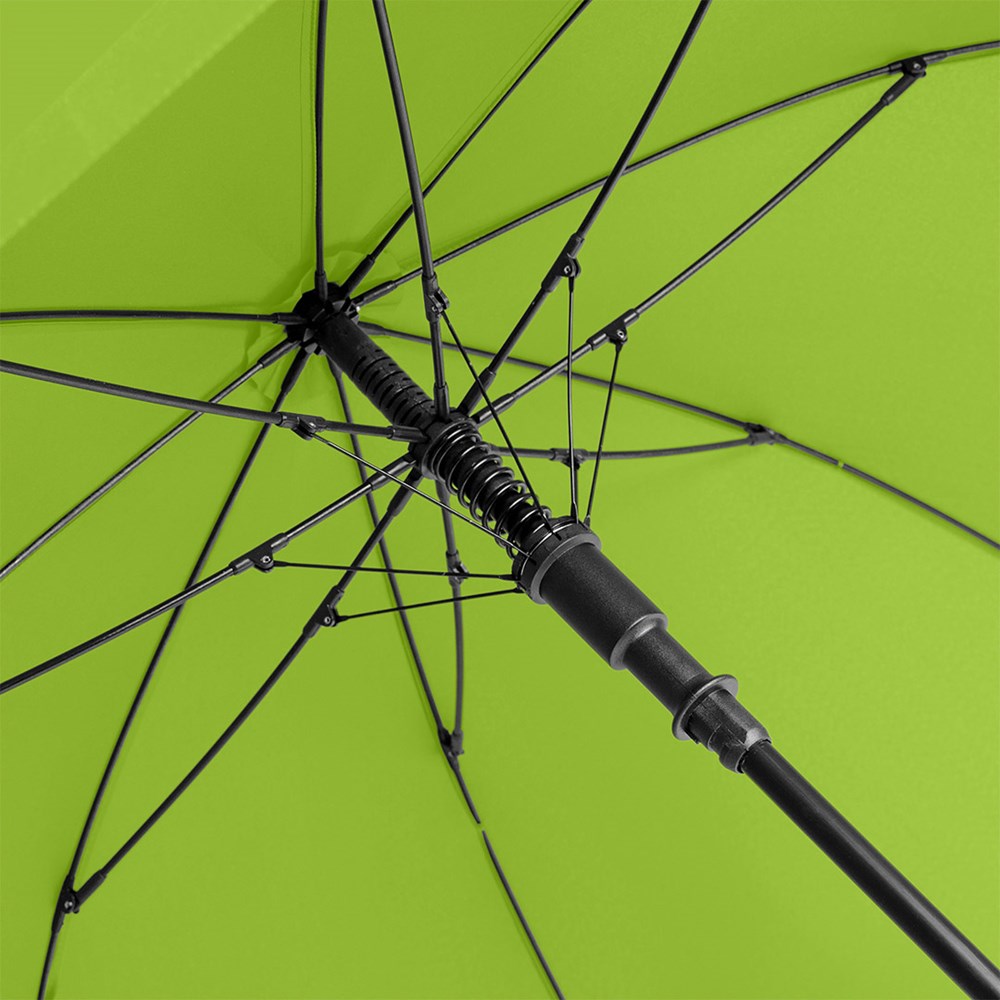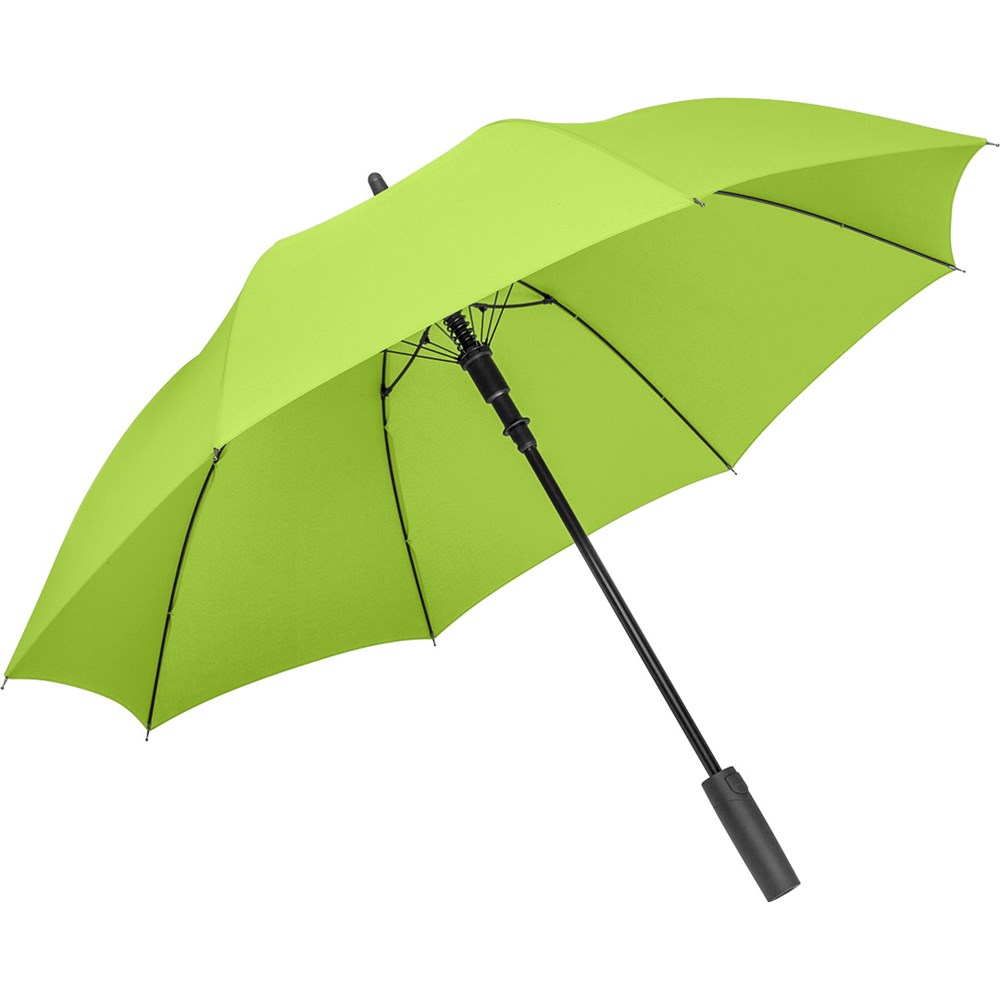 Preislich attraktiver Automatik-Stockschirm mit Windproof-PLUS-System Komfortable Automatik-Funktion zum schnellen Öffnen, hochwertiges Windproof-PLUS-System für eine maximale Gestell-Flexibilität bei stärkeren Windböen, flexible Fiberglasschienen, höherer Korrosionsschutz durch schwarze Galvanisierung des Stahlstocks, handsympathischer Soft-Feel-Griff mit integrierter Auslösetaste und Werbeanbringungsmöglichkeit.