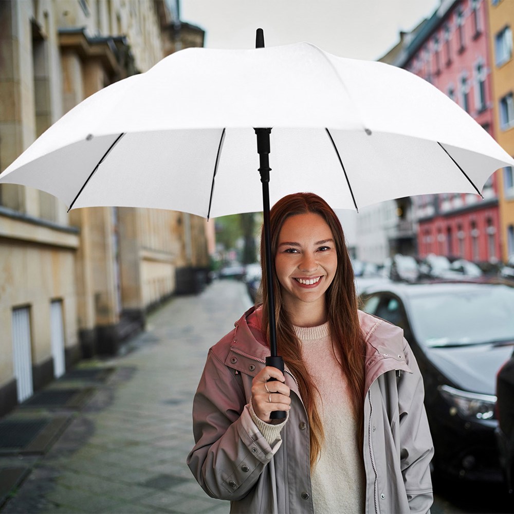 Preislich attraktiver Automatik-Stockschirm mit Windproof-PLUS-System Komfortable Automatik-Funktion zum schnellen Öffnen, hochwertiges Windproof-PLUS-System für eine maximale Gestell-Flexibilität bei stärkeren Windböen, flexible Fiberglasschienen, höherer Korrosionsschutz durch schwarze Galvanisierung des Stahlstocks, handsympathischer Soft-Feel-Griff mit integrierter Auslösetaste und Werbeanbringungsmöglichkeit.