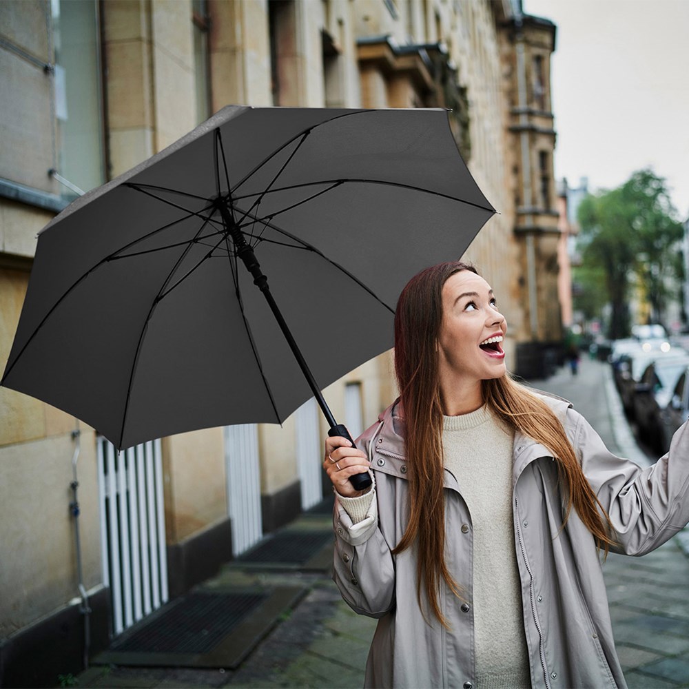 Preislich attraktiver Automatik-Stockschirm mit Windproof-PLUS-System Komfortable Automatik-Funktion zum schnellen Öffnen, hochwertiges Windproof-PLUS-System für eine maximale Gestell-Flexibilität bei stärkeren Windböen, flexible Fiberglasschienen, höherer Korrosionsschutz durch schwarze Galvanisierung des Stahlstocks, handsympathischer Soft-Feel-Griff mit integrierter Auslösetaste und Werbeanbringungsmöglichkeit.