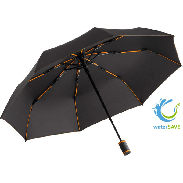 Stylischer Doppelautomatik-Taschenschirm mit farbigen Elementen Komfortable Doppelautomatik-Funktion zum schnellen Öffnen und Schließen, hochwertiges Windproof-PLUS-System für eine maximale Gestell-Flexibilität bei stärkeren Windböen, flexible Fiberglasschienen, Polyester-Pongee Bezugsmaterial aus recycelten Kunststoffen, umweltfreundlich dank original waterSAVE Bezugsmaterial, mit waterSAVE®-Label auf dem Schließband, ansprechendes Design durch farbige Schienen, Griffringe und Nähte, handsympathischer Soft-Feel-Griff mit integrierter Auslösetaste und Werbeanbringungsmöglichkeit, komfortables Futteral mit farbigen Nähten und Tragegurten. Auch als Taschenschirm (Art. 5084, 5584), Midsize-Schirm (Art. 4784) und Gästeschirm (Art. 2384) erhältlich.