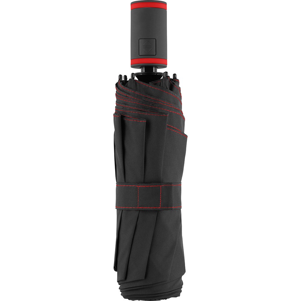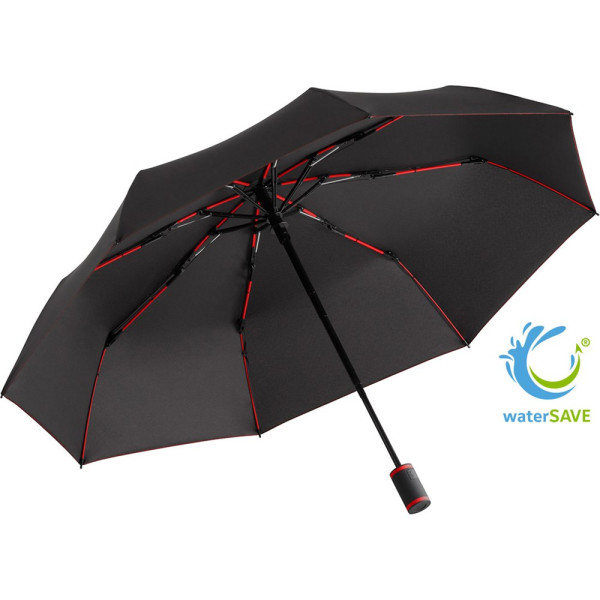 Stylischer Doppelautomatik-Taschenschirm mit farbigen Elementen Komfortable Doppelautomatik-Funktion zum schnellen Öffnen und Schließen, hochwertiges Windproof-PLUS-System für eine maximale Gestell-Flexibilität bei stärkeren Windböen, flexible Fiberglasschienen, Polyester-Pongee Bezugsmaterial aus recycelten Kunststoffen, umweltfreundlich dank original waterSAVE Bezugsmaterial, mit waterSAVE®-Label auf dem Schließband, ansprechendes Design durch farbige Schienen, Griffringe und Nähte, handsympathischer Soft-Feel-Griff mit integrierter Auslösetaste und Werbeanbringungsmöglichkeit, komfortables Futteral mit farbigen Nähten und Tragegurten. Auch als Taschenschirm (Art. 5084, 5584), Midsize-Schirm (Art. 4784) und Gästeschirm (Art. 2384) erhältlich.