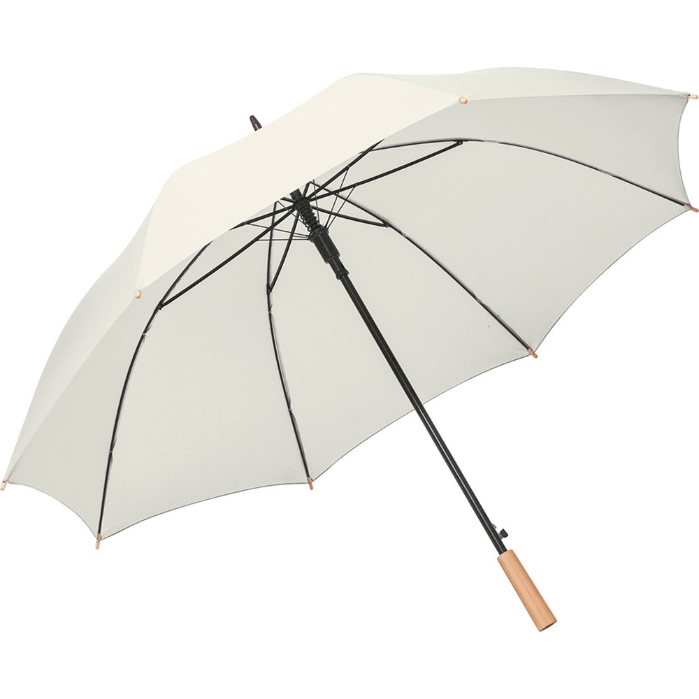 Preislich attraktiver nachhaltiger Gästeschirm mit Bezug aus recycelten Kunststoffen und Echtholzelementen Komfortable Automatik-Funktion zum schnellen Öffnen, hochwertiges Windproof-PLUS-System für eine maximale Gestell-Flexibilität bei stärkeren Windböen, flexible Fiberglasschienen, wassersparend gefärbtes Polyester-Pongee waterSAVE® Bezugsmaterial aus recycelten Kunststoffen, mit waterSAVE®-Label auf dem Schließband, Echtholzspitzen, gerader Echtholzgriff mit Werbeanbringungsmöglichkeit, höherer Korrosionsschutz durch schwarze Galvanisierung des Stahlstocks