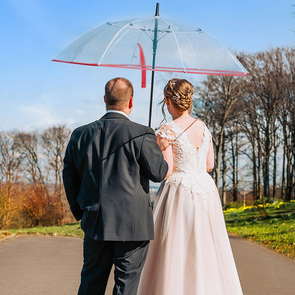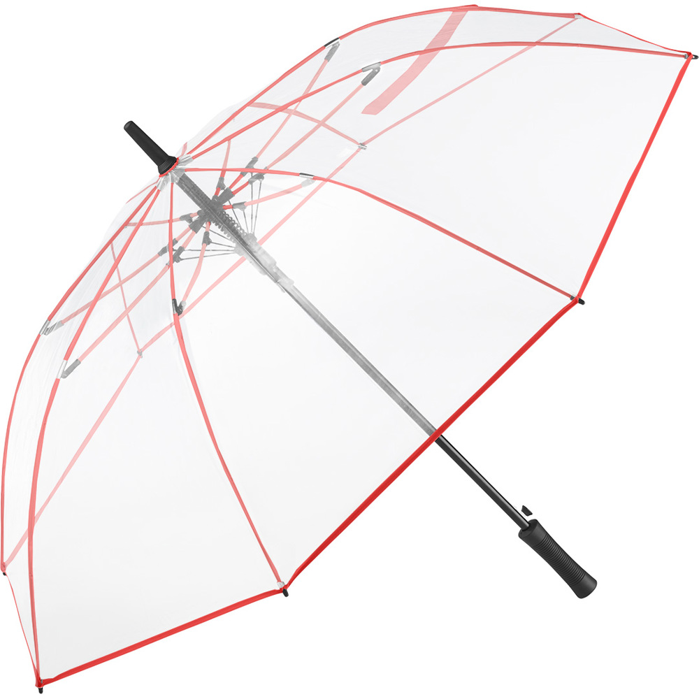 Ansprechender Automatik-Gästeschirm für zwei Personen mit transparentem Bezug und farbigen Details Komfortable Automatik-Funktion zum schnellen Öffnen, hochwertiges Windproof-PLUS-System für eine maximale Gestell-Flexibilität bei stärkeren Windböen, flexible Fiberglasschienen, farblich aufeinander abgestimmte Design-Elemente, matt-schwarzer gerader Kunststoffgriff mit Werbeanbringungsmöglichkeit, höherer Korrosionsschutz durch schwarze Galvanisierung des Stahlstocks