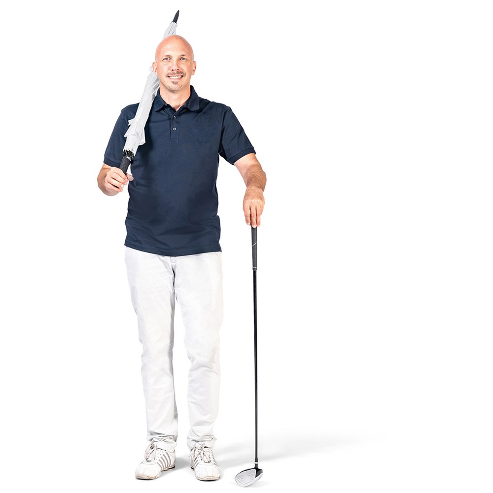 Exklusiver Automatik-Golf-/Gästeschirm für zwei Personen mit Golf-Design-Griff Komfortable Automatik-Funktion zum schnellen Öffnen, hochwertiges Windproof-PLUS-System für eine maximale Gestell-Flexibilität bei stärkeren Windböen, stabiler Fiberglasstock, flexible Fiberglasschienen, überlappender Ventilationsbezug zur Regulierung von Überdruck durch stärkere Windböen, Bezug mit zwei Schließbändern zur optimalen Fixierung im geschlossenen Zustand, exklusiver Soft-Touch-Griff in Golfball-Haptik mit silberner Auslösetaste und Werbeanbringungsmöglichkeit, komfortables Tragefutteral, gastfreundlicher großer Durchmesser