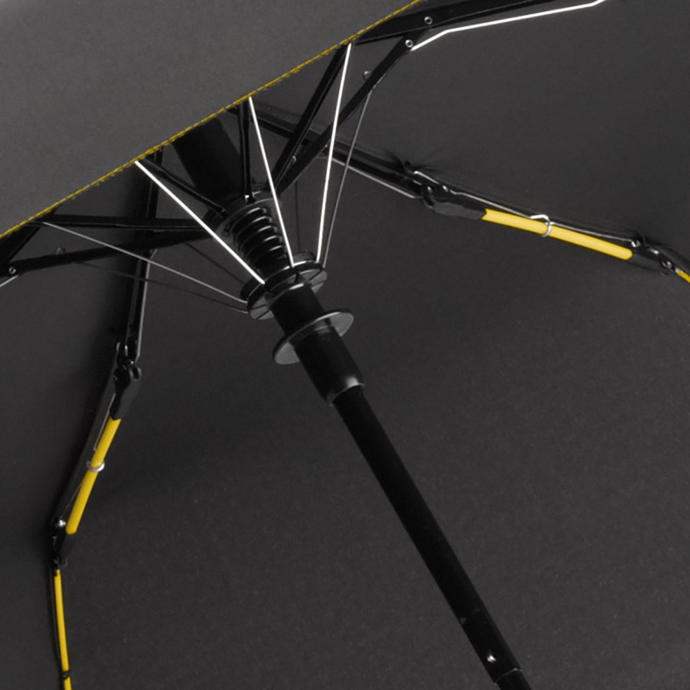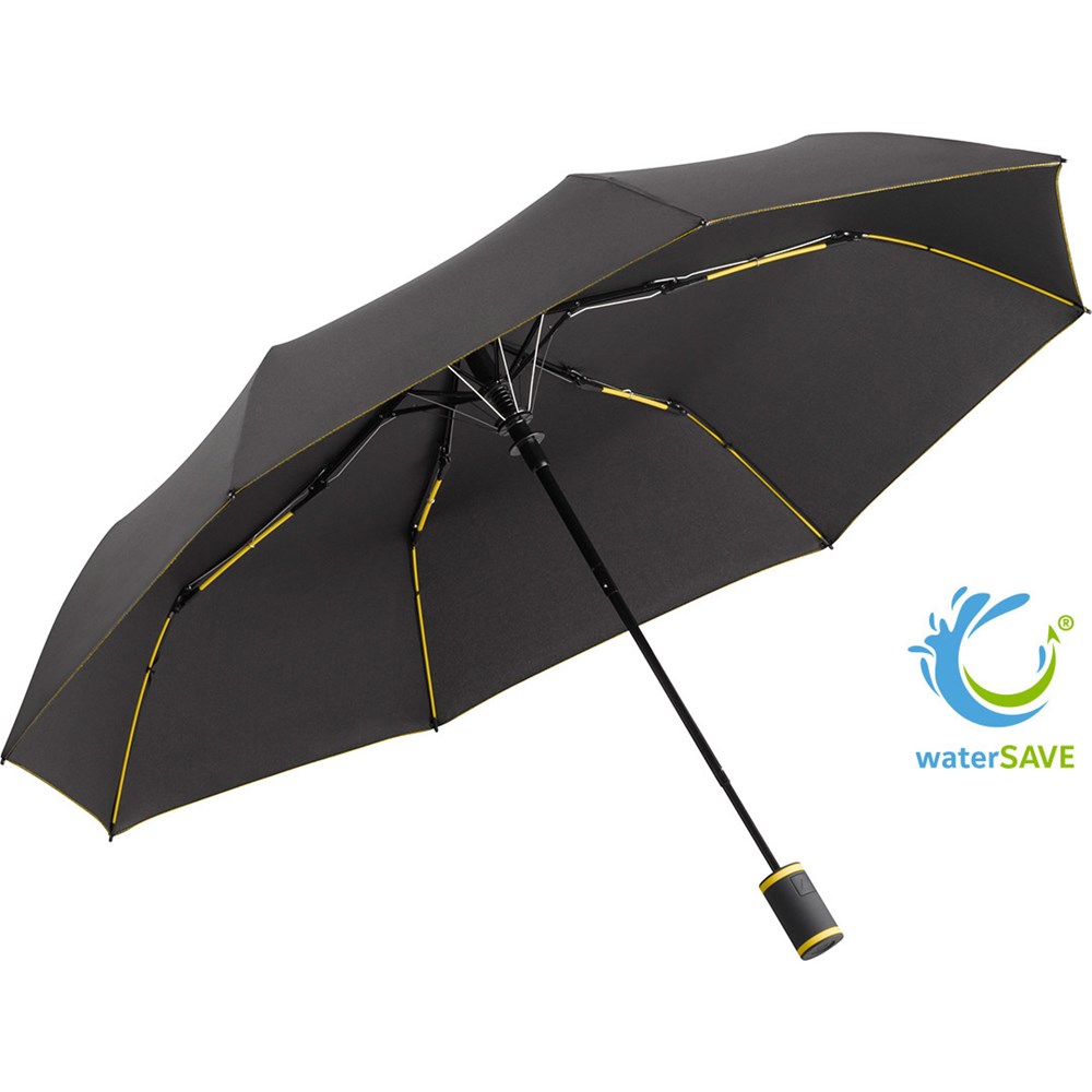 Stylischer Automatik-Taschenschirm mit farbigen Elementen Komfortable Automatik-Funktion zum schnellen Öffnen, hochwertiges Windproof-PLUS-System für eine maximale Gestell-Flexibilität bei stärkeren Windböen, flexible Fiberglasschienen, Polyester-Pongee Bezugsmaterial aus recycelten Kunststoffen, umweltfreundlich dank original waterSAVE® Bezugsmaterial, mit waterSAVE® Label auf dem Schließband, ansprechendes Design durch farbige Schienen, Griffringe und Nähte, Soft-Feel-Griff mit Auslösetaste und Werbeanbringungsmöglichkeit, komfortables Tragefutteral mit farbigen Nähten und farblich passender elastischer Zugkordel. Auch als Taschenschirm (Art. 5084, 5484), Midsize-Schirm (Art. 4784) und Gästeschirm (Art. 2384) erhältlich.