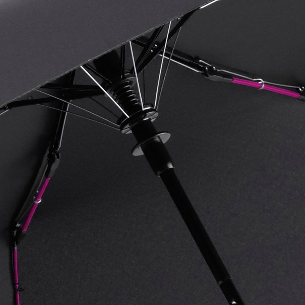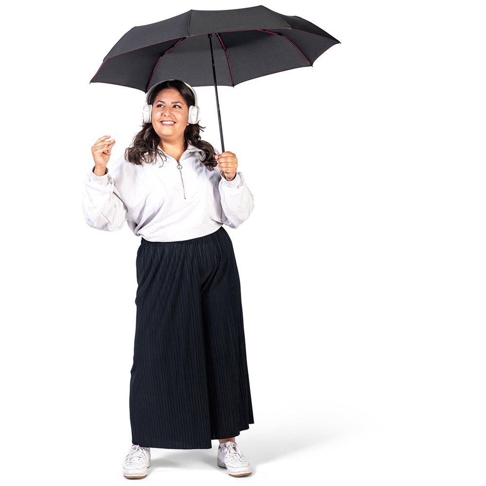Stylischer Automatik-Taschenschirm mit farbigen Elementen Komfortable Automatik-Funktion zum schnellen Öffnen, hochwertiges Windproof-PLUS-System für eine maximale Gestell-Flexibilität bei stärkeren Windböen, flexible Fiberglasschienen, Polyester-Pongee Bezugsmaterial aus recycelten Kunststoffen, umweltfreundlich dank original waterSAVE® Bezugsmaterial, mit waterSAVE® Label auf dem Schließband, ansprechendes Design durch farbige Schienen, Griffringe und Nähte, Soft-Feel-Griff mit Auslösetaste und Werbeanbringungsmöglichkeit, komfortables Tragefutteral mit farbigen Nähten und farblich passender elastischer Zugkordel. Auch als Taschenschirm (Art. 5084, 5484), Midsize-Schirm (Art. 4784) und Gästeschirm (Art. 2384) erhältlich.
