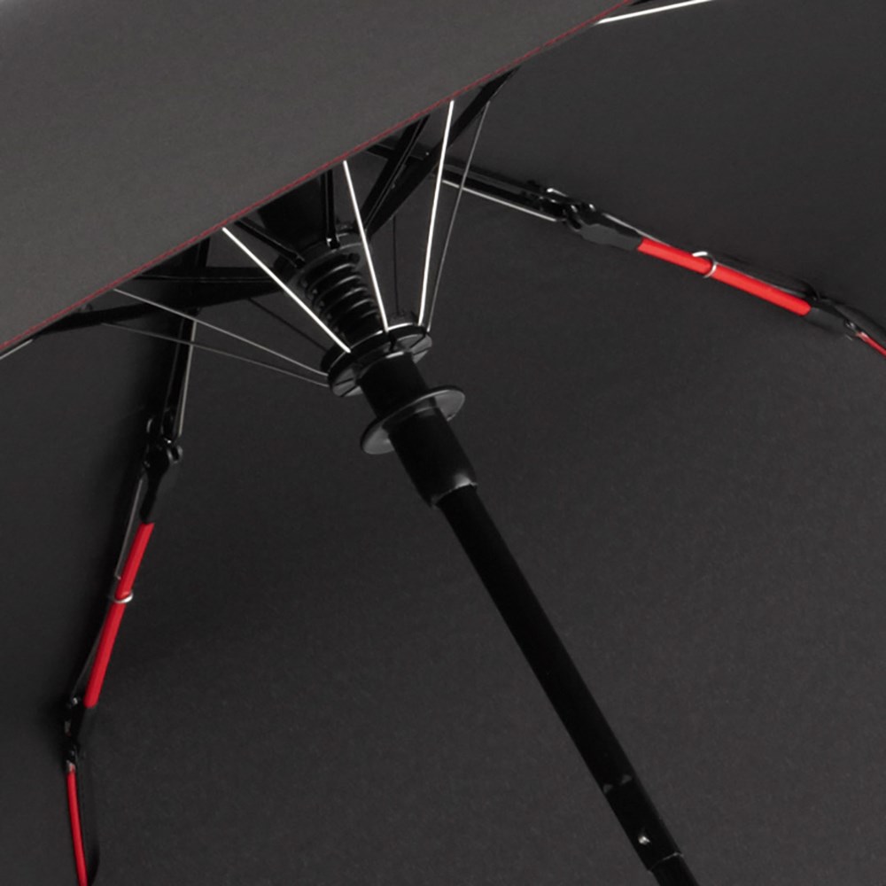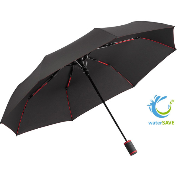 Stylischer Automatik-Taschenschirm mit farbigen Elementen Komfortable Automatik-Funktion zum schnellen Öffnen, hochwertiges Windproof-PLUS-System für eine maximale Gestell-Flexibilität bei stärkeren Windböen, flexible Fiberglasschienen, Polyester-Pongee Bezugsmaterial aus recycelten Kunststoffen, umweltfreundlich dank original waterSAVE® Bezugsmaterial, mit waterSAVE® Label auf dem Schließband, ansprechendes Design durch farbige Schienen, Griffringe und Nähte, Soft-Feel-Griff mit Auslösetaste und Werbeanbringungsmöglichkeit, komfortables Tragefutteral mit farbigen Nähten und farblich passender elastischer Zugkordel. Auch als Taschenschirm (Art. 5084, 5484), Midsize-Schirm (Art. 4784) und Gästeschirm (Art. 2384) erhältlich.