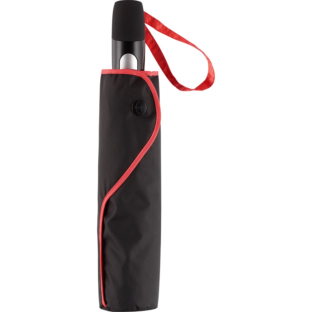 Schicker Doppelautomatik-Taschenschirm in Übergröße mit farbigen Highlights Komfortable Doppelautomatik-Funktion zum schnellen Öffnen und Schließen, hochwertiges Windproof-PLUS-System für eine maximale Gestell-Flexibilität bei stärkeren Windböen, auffällige Verzierung des Bezugs durch farbige Segmentnahtpaspeln, matt / glänzend abgesetzter Soft-Feel-Griff mit integrierter Auslösetaste und Werbeanbringungsmöglichkeit, farbige Griffschlaufe, Futteral mit Druckknopf und farbiger Paspelierung. Auch als Midsize-Schirm (Art. 4399) erhältlich.
