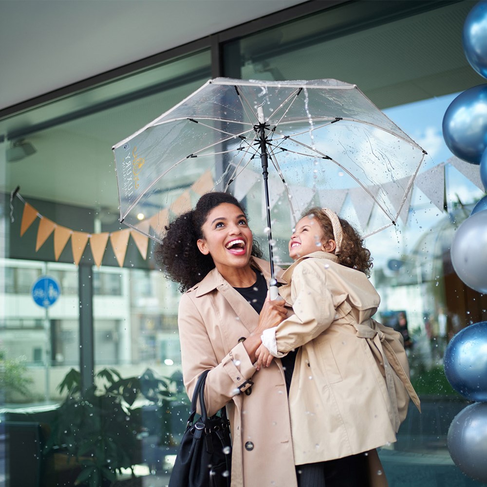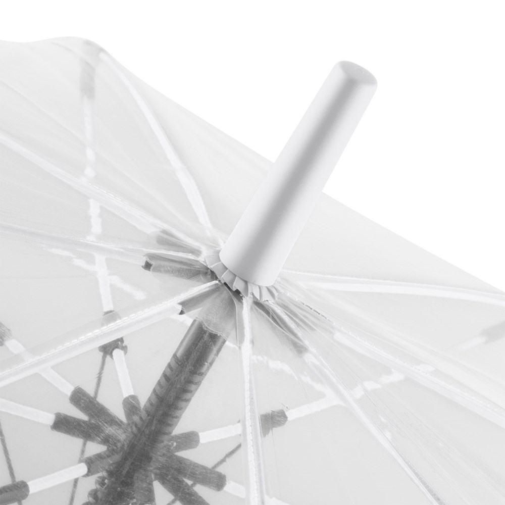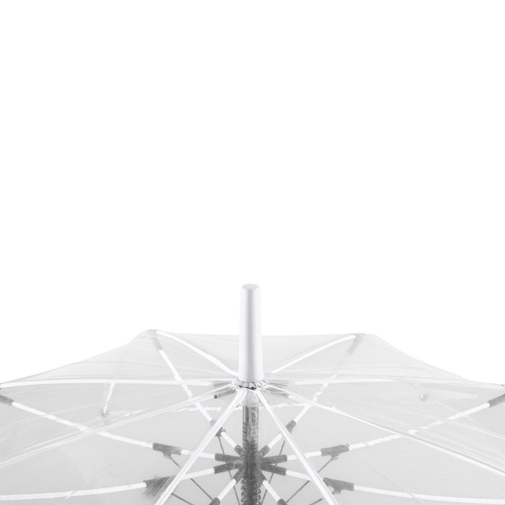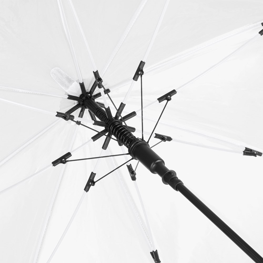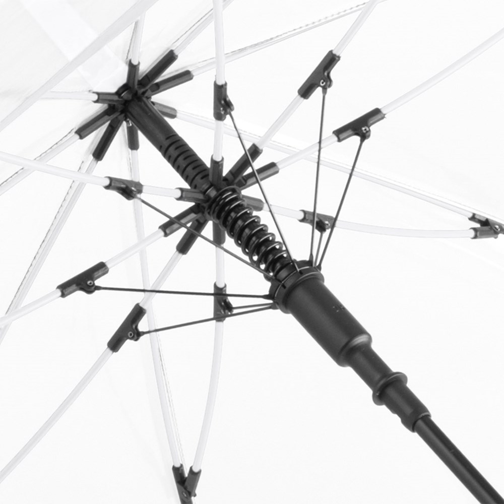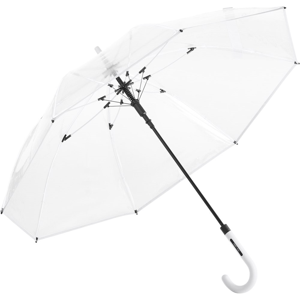 Ansprechender Automatik-Stockschirm mit transparentem Bezug und farbigen Details Komfortable Automatik-Funktion zum schnellen Öffnen, hochwertiges Windproof-PLUS-System für eine maximale Gestell-Flexibilität bei stärkeren Windböen, flexible Fiberglasschienen, farblich aufeinander abgestimmte Design-Elemente, handsympathischer Soft-Touch-Rundhakengriff mit integrierter Auslösetaste und Werbeanbringungsmöglichkeit, höherer Korrosionsschutz durch schwarze Galvanisierung des Stahlstocks