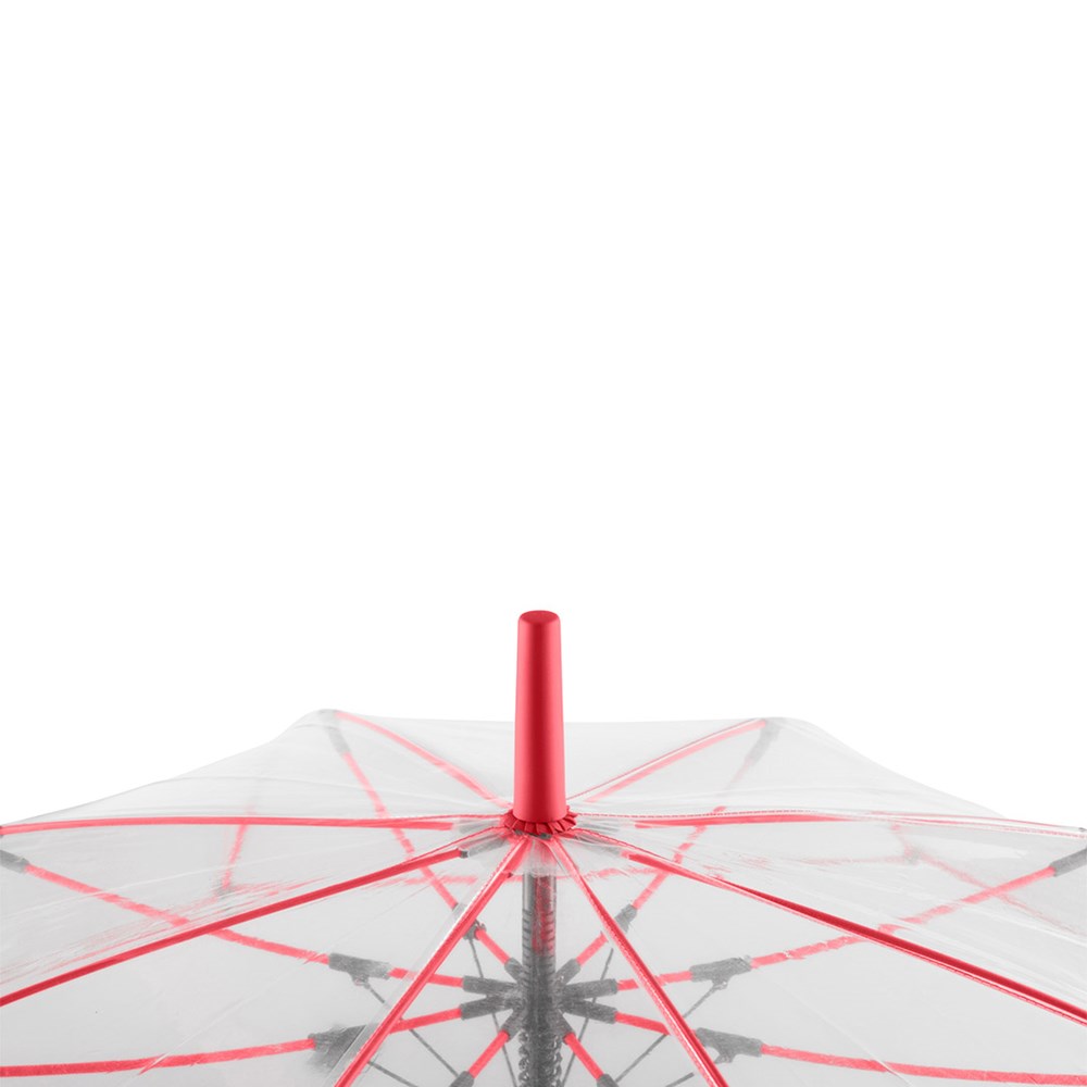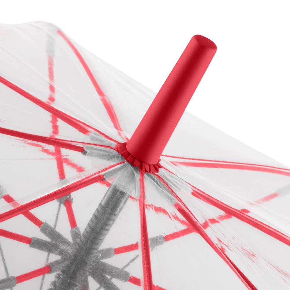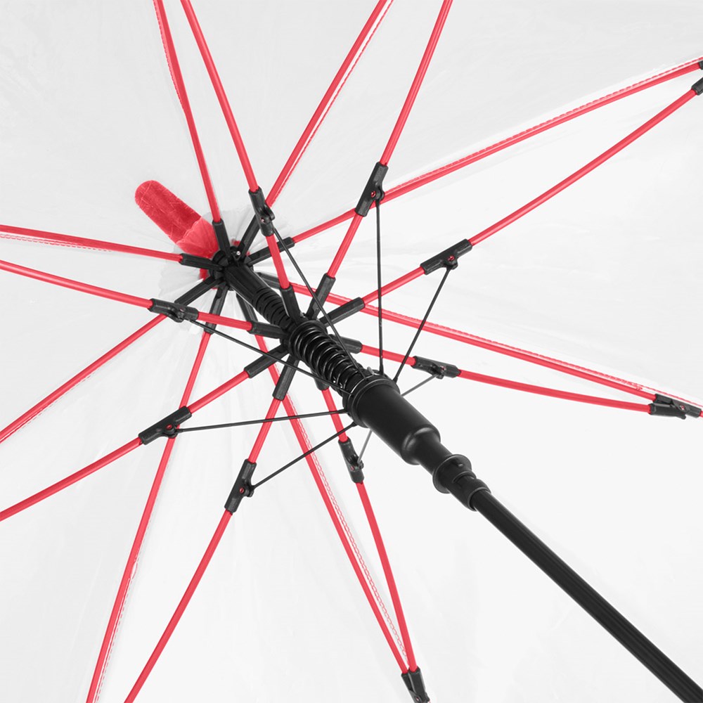 Ansprechender Automatik-Stockschirm mit transparentem Bezug und farbigen Details Komfortable Automatik-Funktion zum schnellen Öffnen, hochwertiges Windproof-PLUS-System für eine maximale Gestell-Flexibilität bei stärkeren Windböen, flexible Fiberglasschienen, farblich aufeinander abgestimmte Design-Elemente, handsympathischer Soft-Touch-Rundhakengriff mit integrierter Auslösetaste und Werbeanbringungsmöglichkeit, höherer Korrosionsschutz durch schwarze Galvanisierung des Stahlstocks