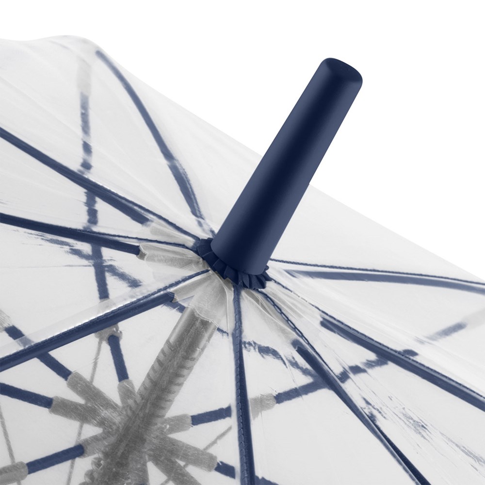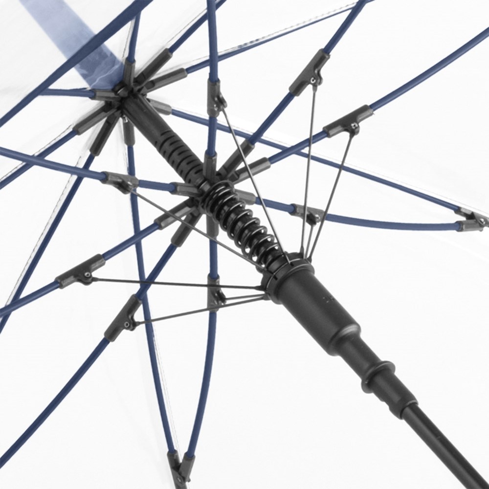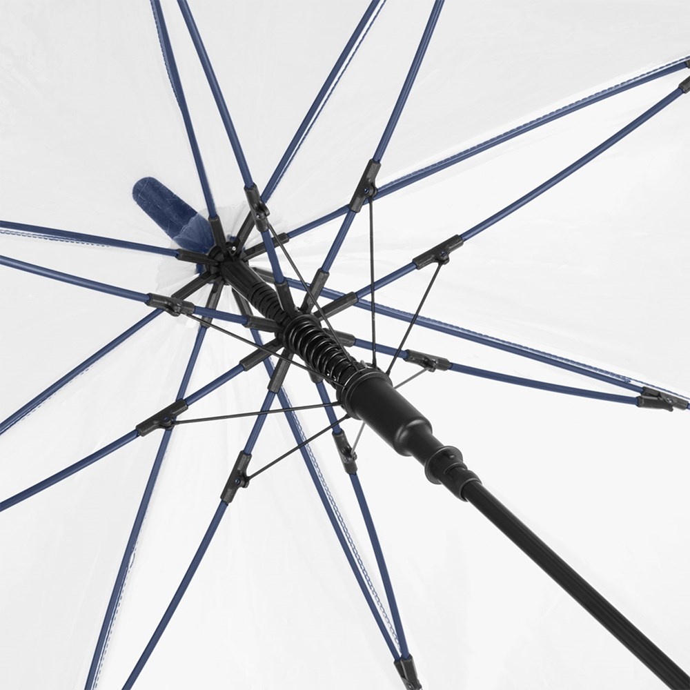 Ansprechender Automatik-Stockschirm mit transparentem Bezug und farbigen Details Komfortable Automatik-Funktion zum schnellen Öffnen, hochwertiges Windproof-PLUS-System für eine maximale Gestell-Flexibilität bei stärkeren Windböen, flexible Fiberglasschienen, farblich aufeinander abgestimmte Design-Elemente, handsympathischer Soft-Touch-Rundhakengriff mit integrierter Auslösetaste und Werbeanbringungsmöglichkeit, höherer Korrosionsschutz durch schwarze Galvanisierung des Stahlstocks