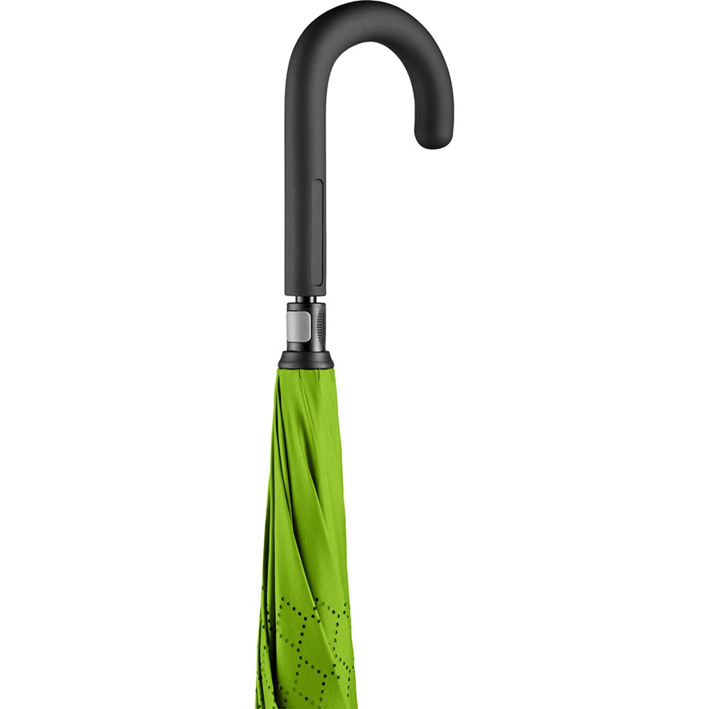 Trendiger Stockschirm mit umgekehrtem Öffnungs- und Schließmechanismus Einfache Handhabung durch Sicherheitsschieber, hochwertiges Windproof-PLUS-System für eine maximale Gestell-Flexibilität bei stärkeren Windböen, von innen nach außen öffnendes Fiberglasgestell, flexible Fiberglasschienen, Doppel-Bezug mit gelasertem Ventilationsmuster zur Vermeidung von Luftstau, Bezug mit modischer Reflexpaspel in Silber, Soft-Touch-Rundhakengriff mit Werbeanbringungsmöglichkeit. Auch als Taschenschirm erhältlich (Art. 5415).