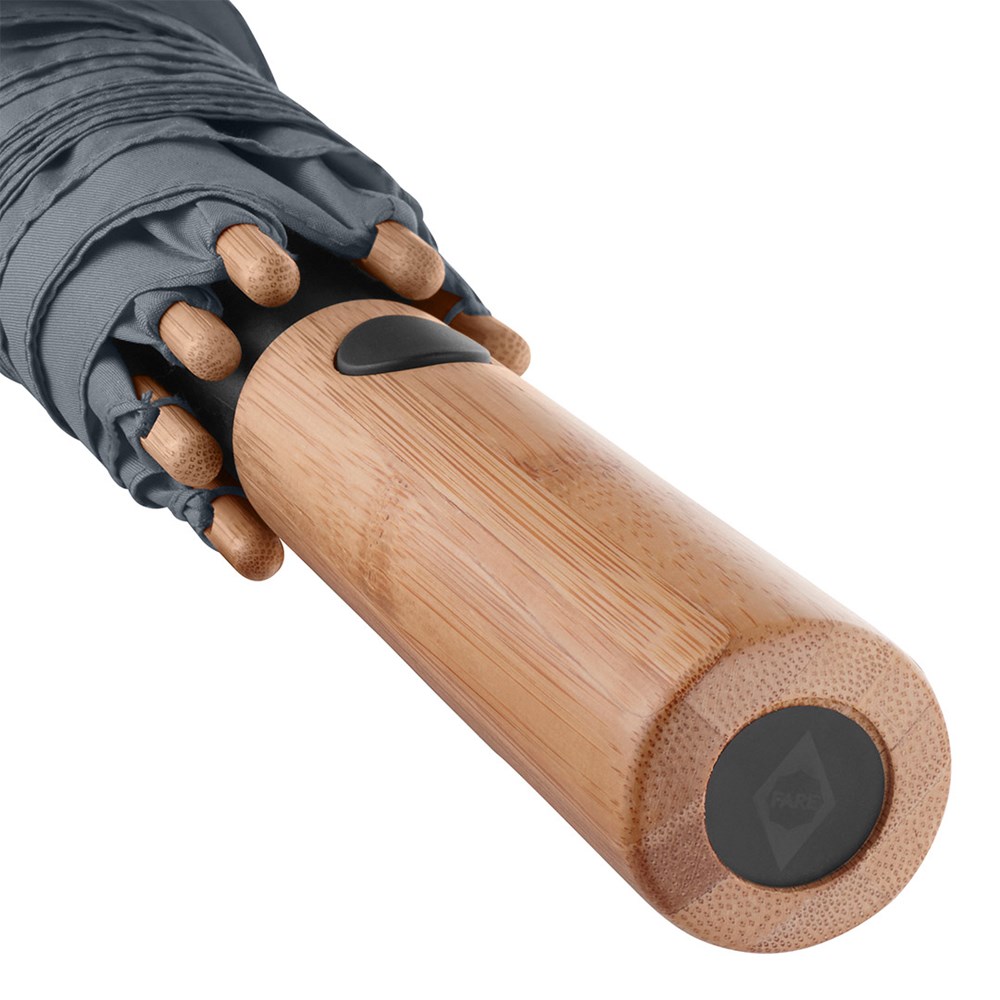 Nachhaltiger Stockschirm in mittlerer Größe mit Elementen aus Bambus und Bezug aus recycelten Kunststoffen Komfortable Automatik-Funktion zum schnellen Öffnen, hochwertiges Windproof-PLUS-System für eine maximale Gestell-Flexibilität bei stärkeren Windböen, flexible Fiberglasschienen, leichter Bambusstock, Polyester-Pongee Bezugsmaterial aus recycelten Kunststoffen, farbabhängig auch mit waterSAVE® Bezugsmaterial erhältlich, mit waterSAVE®-Label auf dem Schließband, Bambus-Spitzen, gerader Bambusgriff mit schwarzer Auslösetaste und Werbeanbringungsmöglichkeit. Auch als Taschenschirm (Art. 5429) erhältlich.