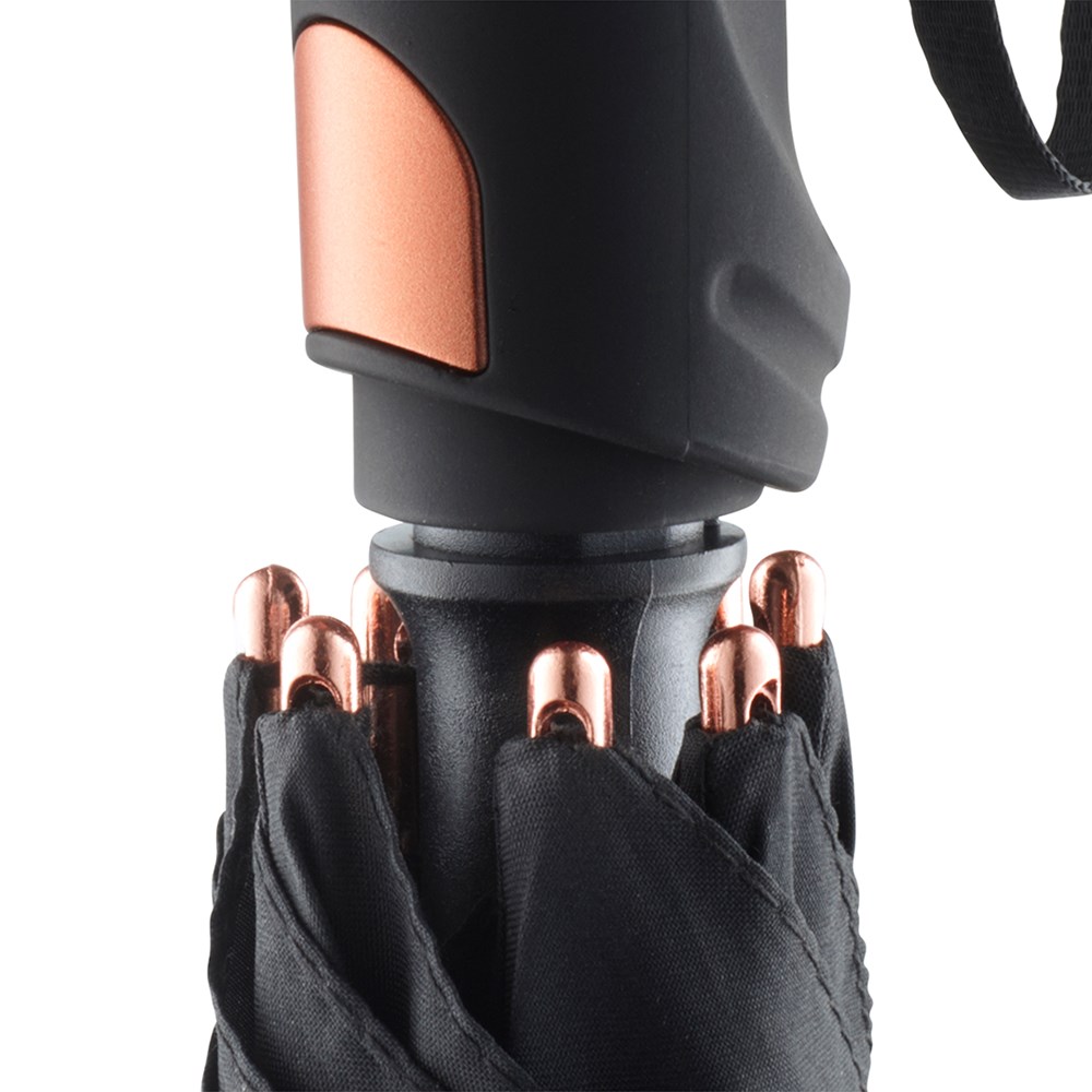 Edler Automatik-Gästeschirm für zwei Personen mit Elementen in Metallic-Farben Komfortable Automatik-Funktion zum schnellen Öffnen, hochwertiges Windproof-PLUS-System für eine maximale Gestell-Flexibilität bei stärkeren Windböen, flexible Fiberglasschienen, Aluminiumstock in matter Metallic-Farbe, Metall-Spitzen und Metall-Druckknopf am Schließband farblich passend zum Stock, matt/glänzend abgesetzter Soft-Feel-Griff mit integrierter Auslösetaste und Werbeanbringungsmöglichkeit