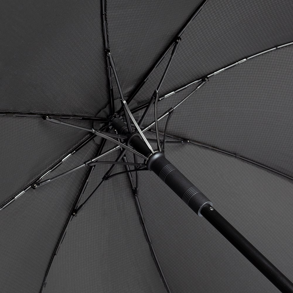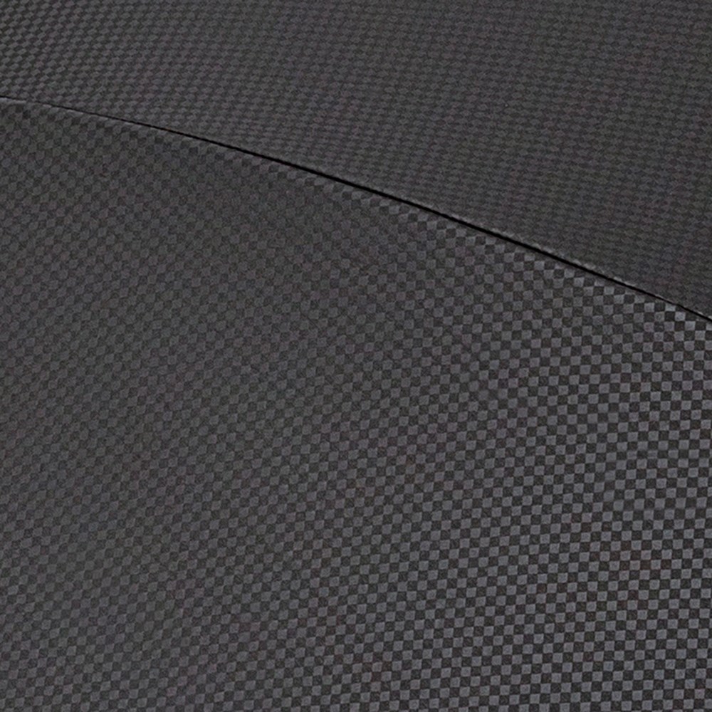 Stylischer Automatik-Gästeschirm für zwei Personen mit verkürztem Schließmechanismus und Griff in edler Carbon-Optik Komfortable Automatik-Funktion zum schnellen Öffnen, hochwertiges Windproof-PLUS-System für eine maximale Gestell-Flexibilität bei stärkeren Windböen, flexible Fiberglasschienen, stabiler Stahlstock mit verkürztem Schließmechanismus zum komfortableren Schließen, wassersparend gefärbtes Polyester-Pongee waterSAVE® Bezugsmaterial aus recycelten Kunststoffen, mit waterSAVE®-Label auf dem Schließband (bei neuen Chargen), Bezug in edlem Ton-in-Ton Caro-Dessin, stylischer Soft-Touch-Rundhakengriff mit Details in Carbon-Optik, Auslösetaste und Werbeanbringungsmöglichkeit