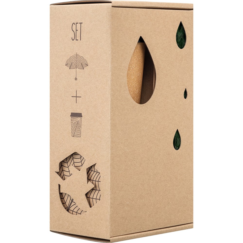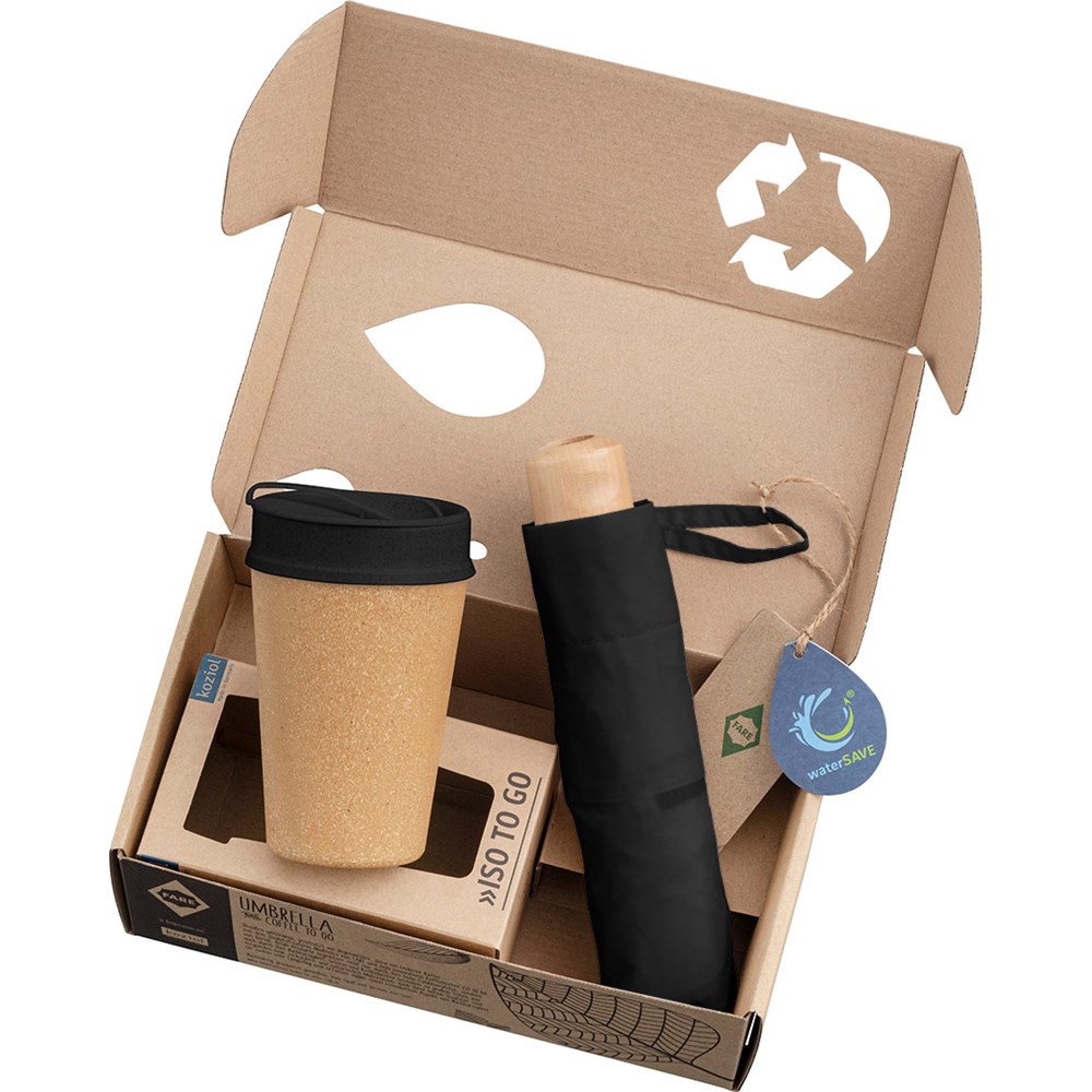 Nachhaltiges Set bestehend aus Taschenschirm und Isolierbecher Schirm: Nachhaltiger Handöffner-Taschenschirm mit wassersparend gefärbtem Polyester-Pongee waterSAVE® Bezugsmaterial aus recycelten Kunststoffen und hochwertigem Windproof-PLUS-System für eine maximale Gestell-Flexibilität bei stärkeren Windböen, Echtholzgriff mit Werbeanbringungsmöglichkeit, Becher: Doppelwandiger Thermobecher ISO TO GO von Koziol mit 400 ml Fassungsvermögen, Material lebensmittelecht und vollständig recycelbar, Lasche des innovativen Deckelverschlusses deckt Trinköffnung und Luftloch zuverlässig ab, spülmaschinengeeignet und bruchsicher, Verpackung: Lieferung in bedruckter Kartonage