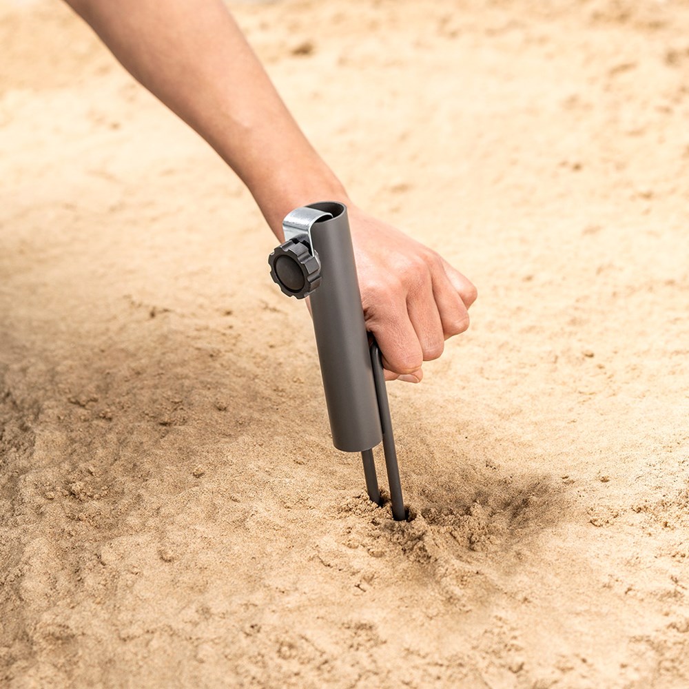 Schirmhalter für Sonnen-, Strand- und Anglerschirme Schirmstütze aus stabilem Stahl mit zwei 17 cm langen Spitzen und Fußtritt/Griff für einfache Anwendung und perfekten Halt in unterschiedlichen Untergründen wie Wiese oder Sand, dank Adapter ist der Erdspieß für Stöcke von 12 bis 26 mm Durchmesser geeignet, bei kleineren Stock-Durchmessern (wie bei Art. 6139) in Kombination mit Adapter nutzbar, der das Material des Schirmstocks schont