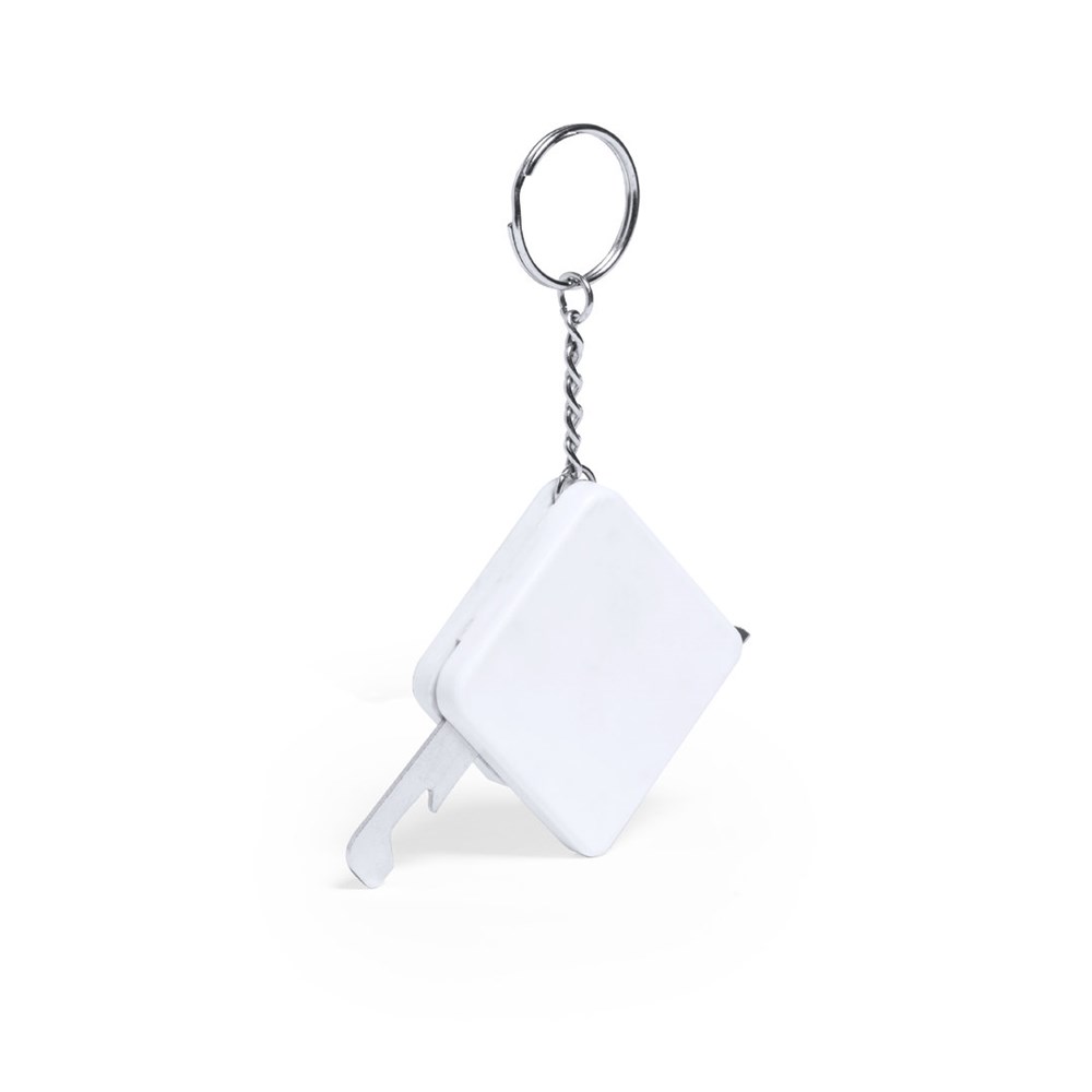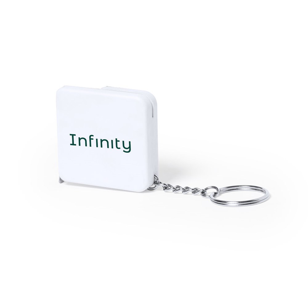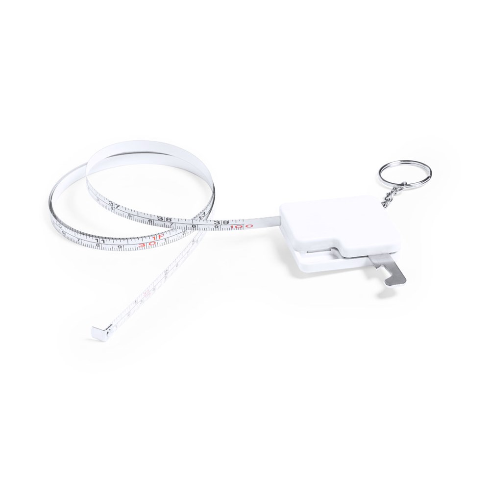 1-m-Flexometer aus widerstandsfähigem weißem ABS, mit im Gehäuse integriertem Metallöffner. Breite Brandingfläche und verchromter Metallring. Klinge mit Maßangaben in Zentimetern und Zoll.
