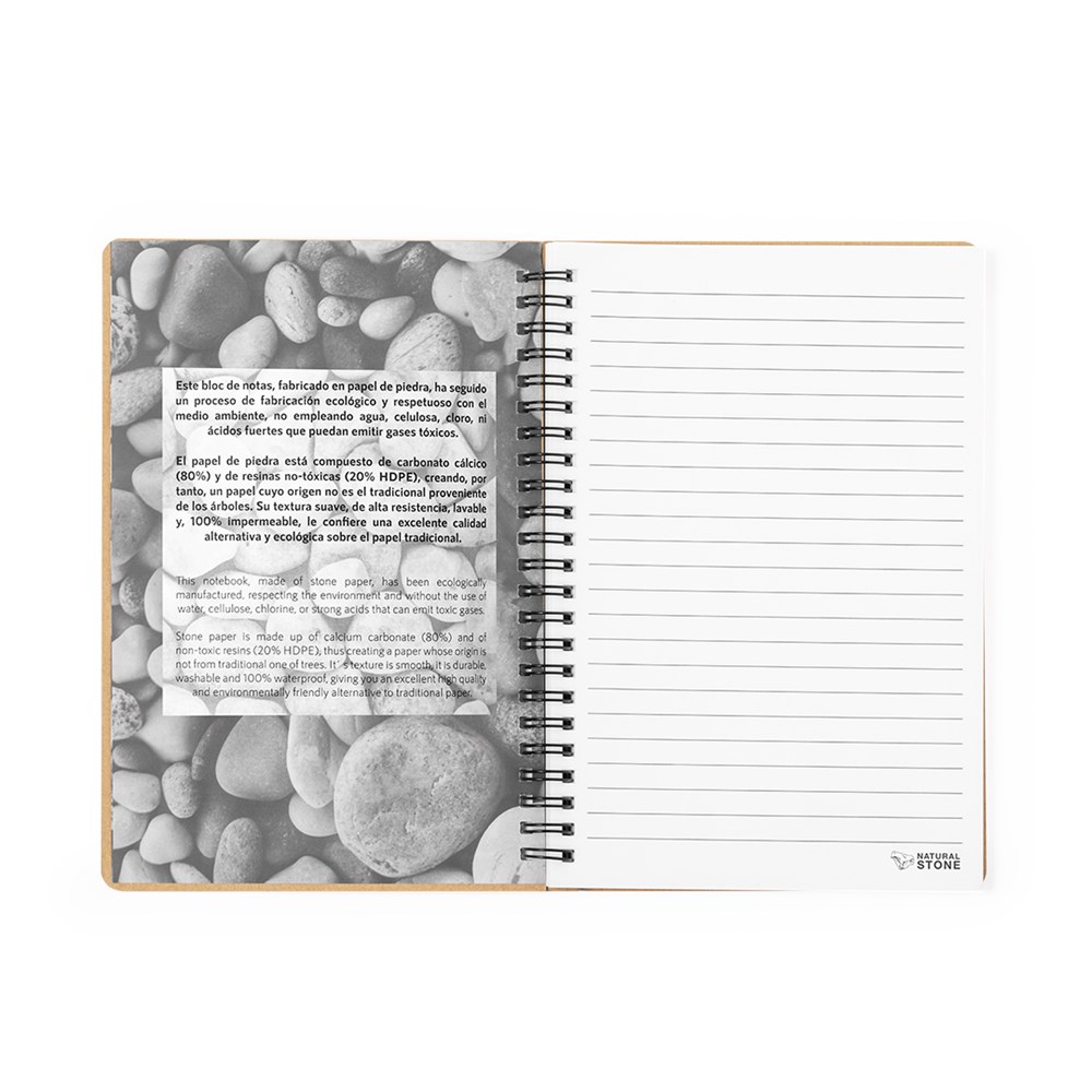 Notizbuch mit doppelten Metallringen und weichem Kartoneinband, mit Blättern aus Steinextrakten. 70 weiße und linierte Blätter, mit eleganter naturfarbener Oberfläche. Logo von Natural Stone auf jedem Blatt. Mit einem Innenblatt, das den Herstellungsprozess aus Steinextrakten erklärt.Das für die Herstellung des Notizbuchs verwendete Material ist zu 100 % recycelbar und chlorfrei, es ist wasserfest, sehr widerstandsfähig und abwaschbar. Es ist somit eine ökologische und nachhaltige Alternative zu konventionellem Papier, das weder traditionell noch von Bäumen stammt.