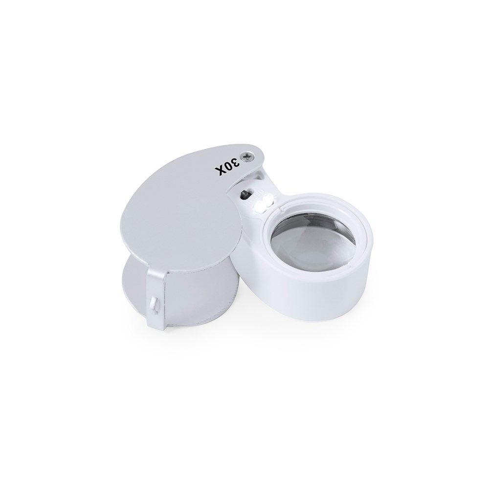 30x Einschlaglupe aus robustem Metall und ABS. Mit integrierter LED-Beleuchtung und großer Vergrößerung für eine sehr nahe Ansicht der kleinsten Details ohne Verzerrung. Ideal für die Inspektion von kleinen Objekten, Text, etc. Die Lupe verfügt über ein Zubehörteil zum Aufhängen und wird in einem Etui mit gepolsterter Innenseite für zusätzlichen Schutz geliefert. Batteriebetrieben (Knopfbatterien im Lieferumfang enthalten), mit speziellem Schlüssel zum Auswechseln, wenn die Batterien leer sind. Präsentiert in einer schwarzen Kartonschachtel.