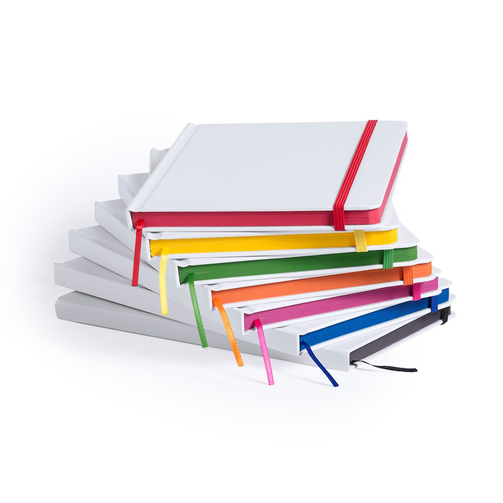Notizblock mit solidem Soft-Touch-Cover in Weiß. Mit 100 Blättern mit farbigen Kanten, Gummibandverschluss und farblich passendem Lesezeichenband.