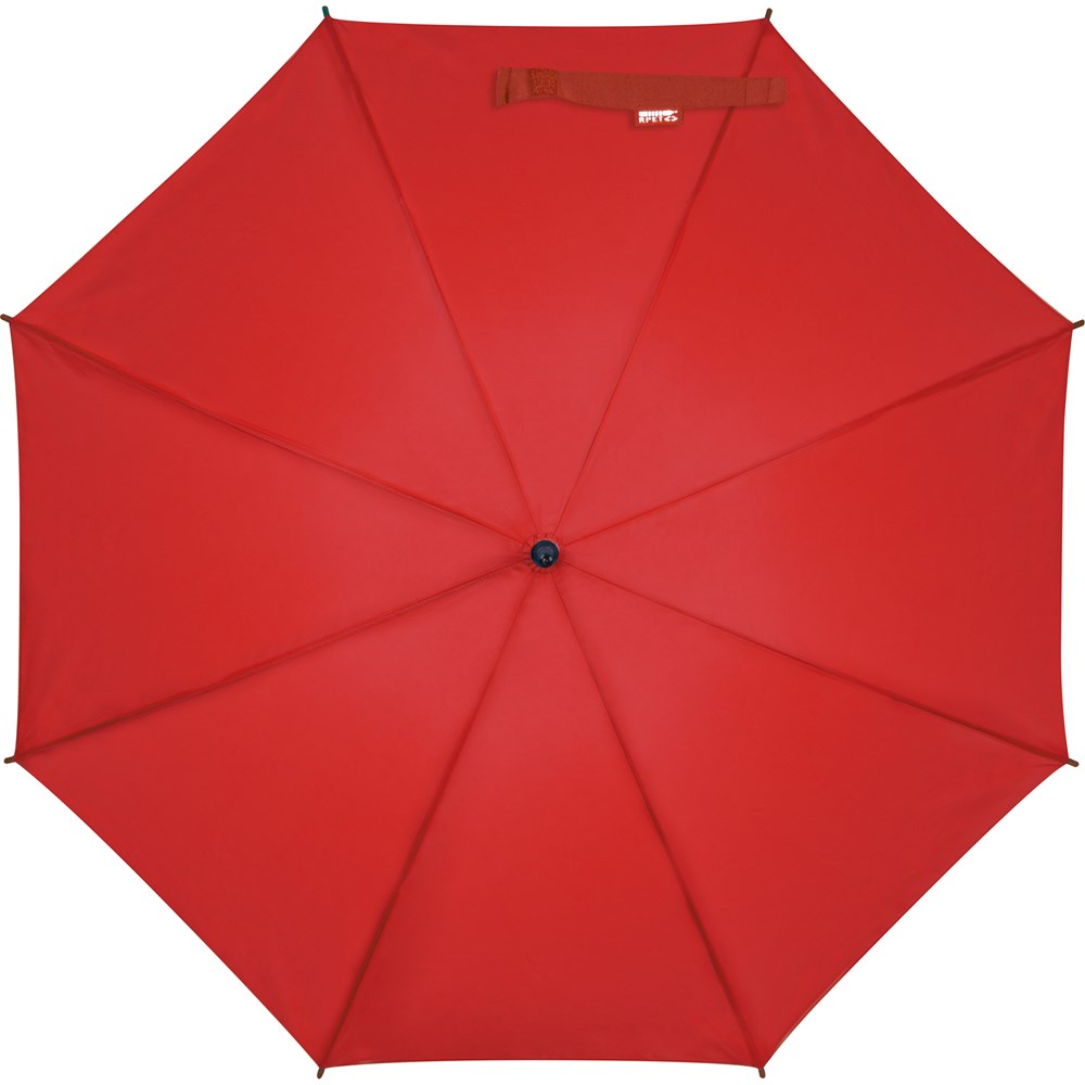 Hochwertiger Automatikregenschirm mit Fiberglasgestänge, Bespannung aus recyceltem PET und gebogenem Holzgriff. Ihre Werbung wird auf ein Segment gedruckt.