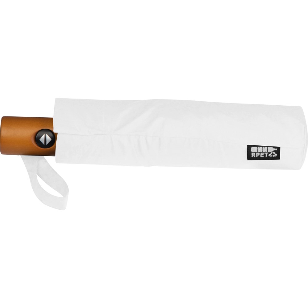 Automatik-Taschenschirm mit Fiberglasgestänge, Bespannung aus recycelten PET-Flaschen, Holzgriff und Handschlaufe. Ihre Werbung wird auf ein Segment gedruckt.